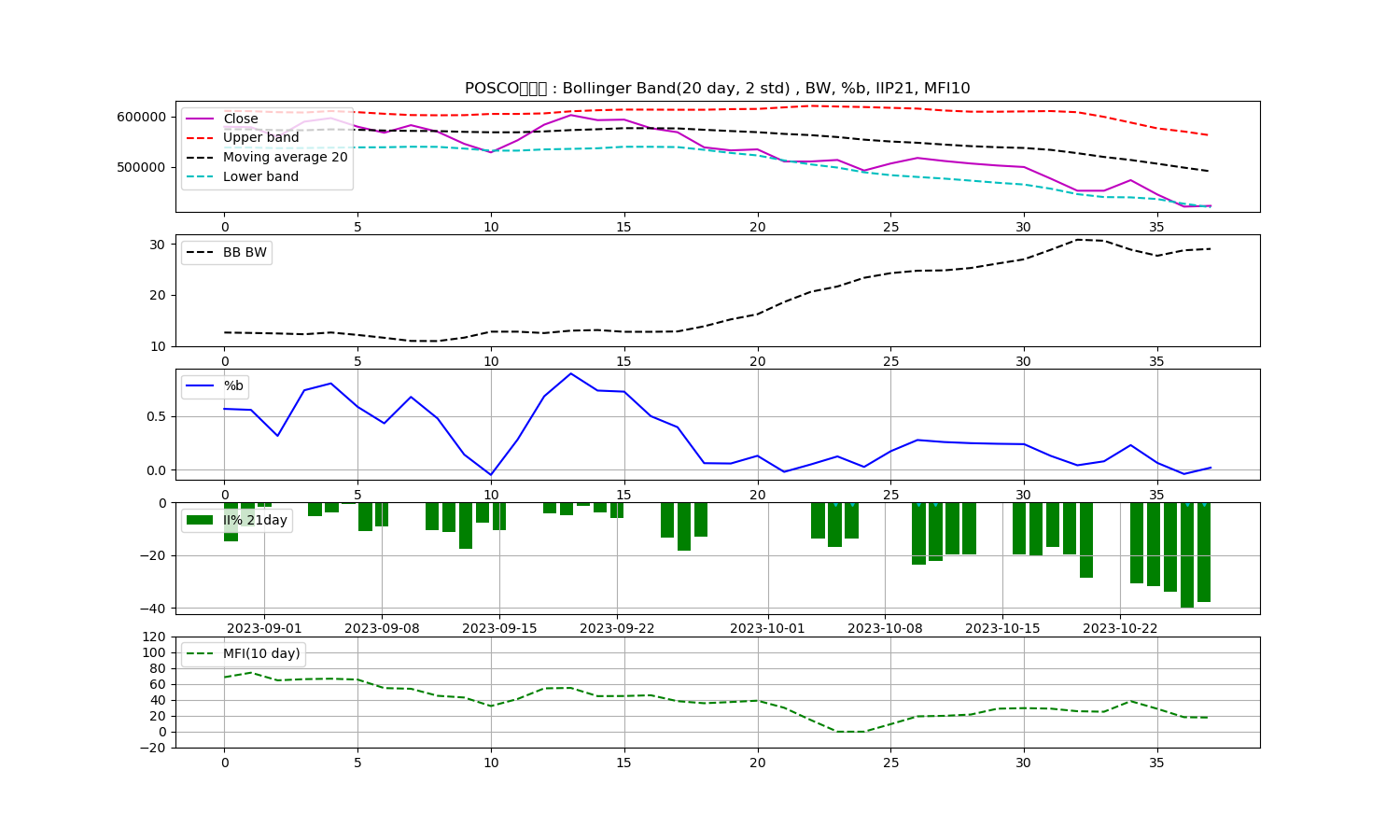 안녕하세요, 두부작가입니다. 오늘은 주식의 종가를 기준으로 볼린저밴드, 일중강도율(IIP), 현금흐름지수(MFI)를 이용한 기술분석을 제공하려고 합니다. 이번에 분석할 종목은 POSCO홀딩스입니다.