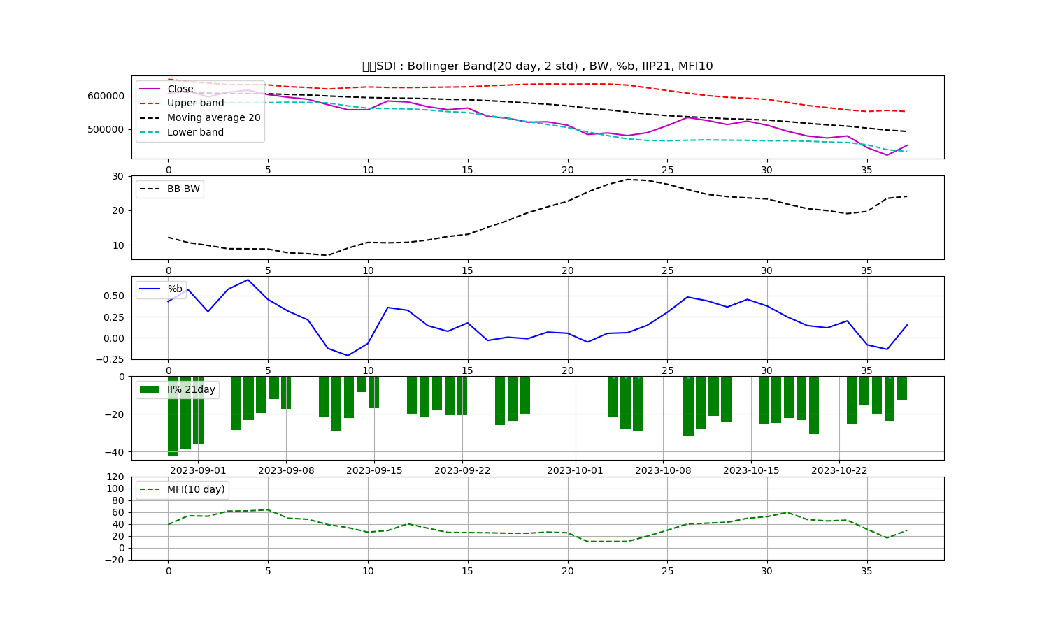 이상으로, 삼성SDI 주식에 대한 볼린저밴드, 일중강도율, 현금흐름지수에 대한 기술분석을 제공해드렸습니다.