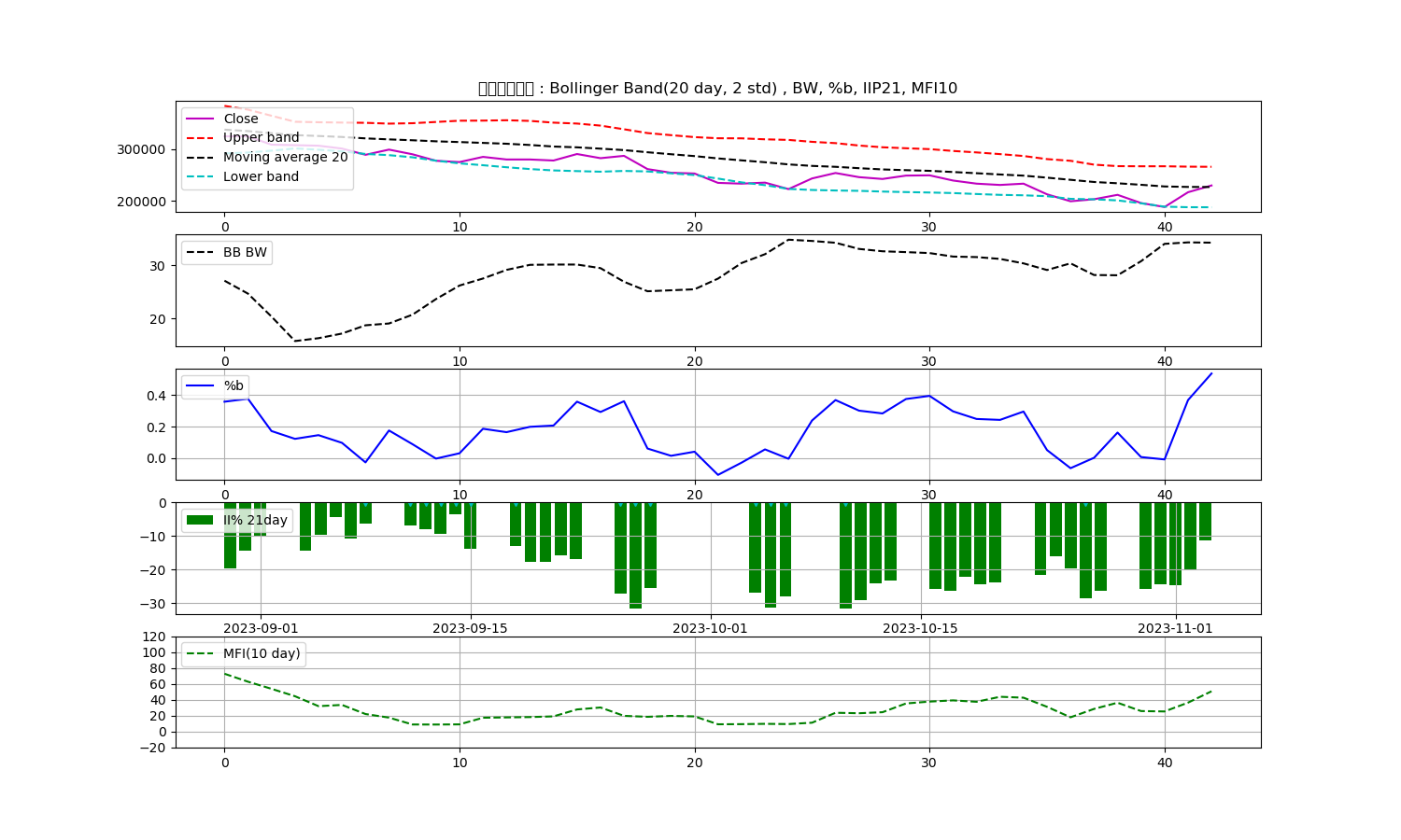 안녕하세요, 주식에 관심 있는 여러분들을 위해 오늘은 에코프로비엠 종목에 대한 기술분석을 제공해드리려고 합니다. 2023년 11월 3일 날짜를 기준으로 종가는 230,000원이었습니다. 이번 분석에서는 볼린저밴드, 일중강도율(IIP), 현금흐름지수(MFI)를 사용하여 종목의 추세와 매매 신호 등을 분석해보겠습니다.