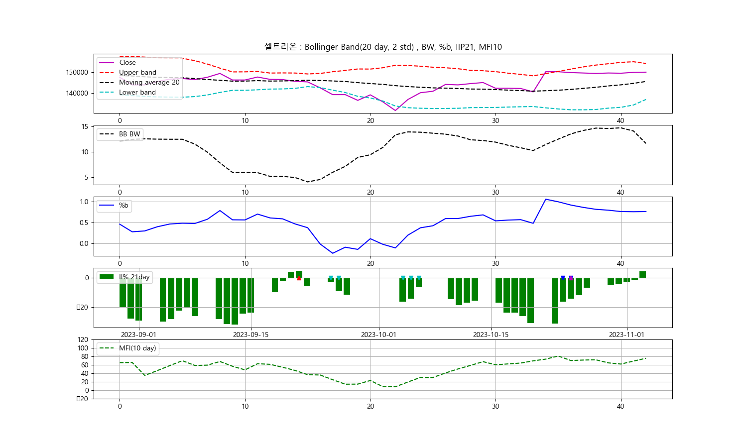 오늘은 셀트리온 종목의 주식 기술분석 결과를 전해드리려고 합니다. 데이터는 2023년 11월 3일의 종가를 기준으로 얻은 결과입니다.