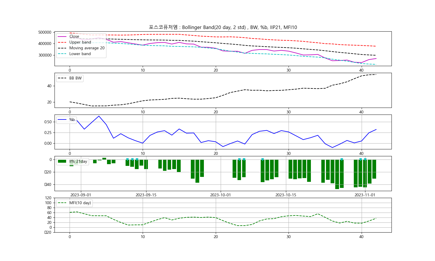 | 기술분석 통한 에코프로 주가 전망 11/3 (볼린저 밴드, 일중강도율(IIP), 현금흐름지수(MFI) 분석) (2) | 2023.11.03 |