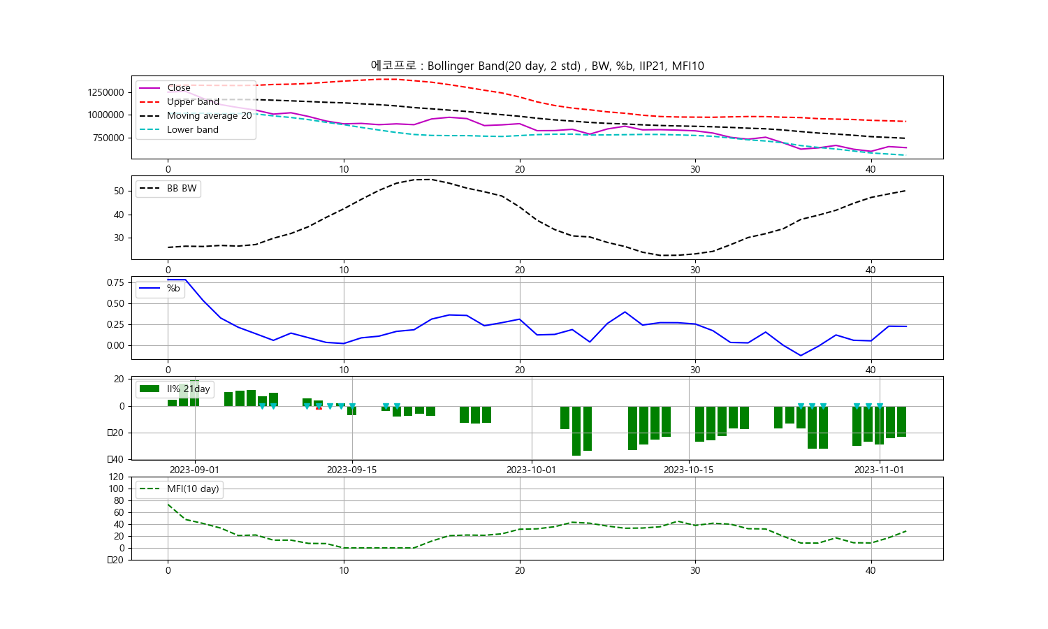 오늘은 주식의 종가를 기준으로 볼린저밴드, 일중강도율(IIP), 현금흐름지수(MFI)를 이용한 기술분석을 제공해 드리려고 합니다. 이번 데이터는 2023년 11월 3일에 기록된 것으로, 해당 날짜에 에코프로라는 종목의 종가는 637,000원입니다.