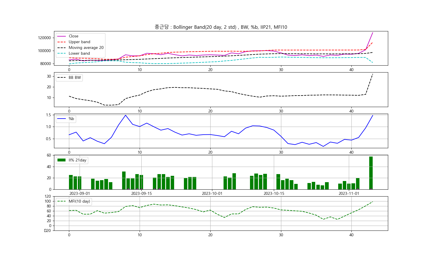 이번에 분석할 데이터는 '날짜: 2023-11-06, 종목: 종근당, 종가: 128,000'입니다. 이 데이터를 통해 볼린저밴드폭, 볼린저밴드 %b, 일중강도율, 현금흐름지수를 계산해보겠습니다.