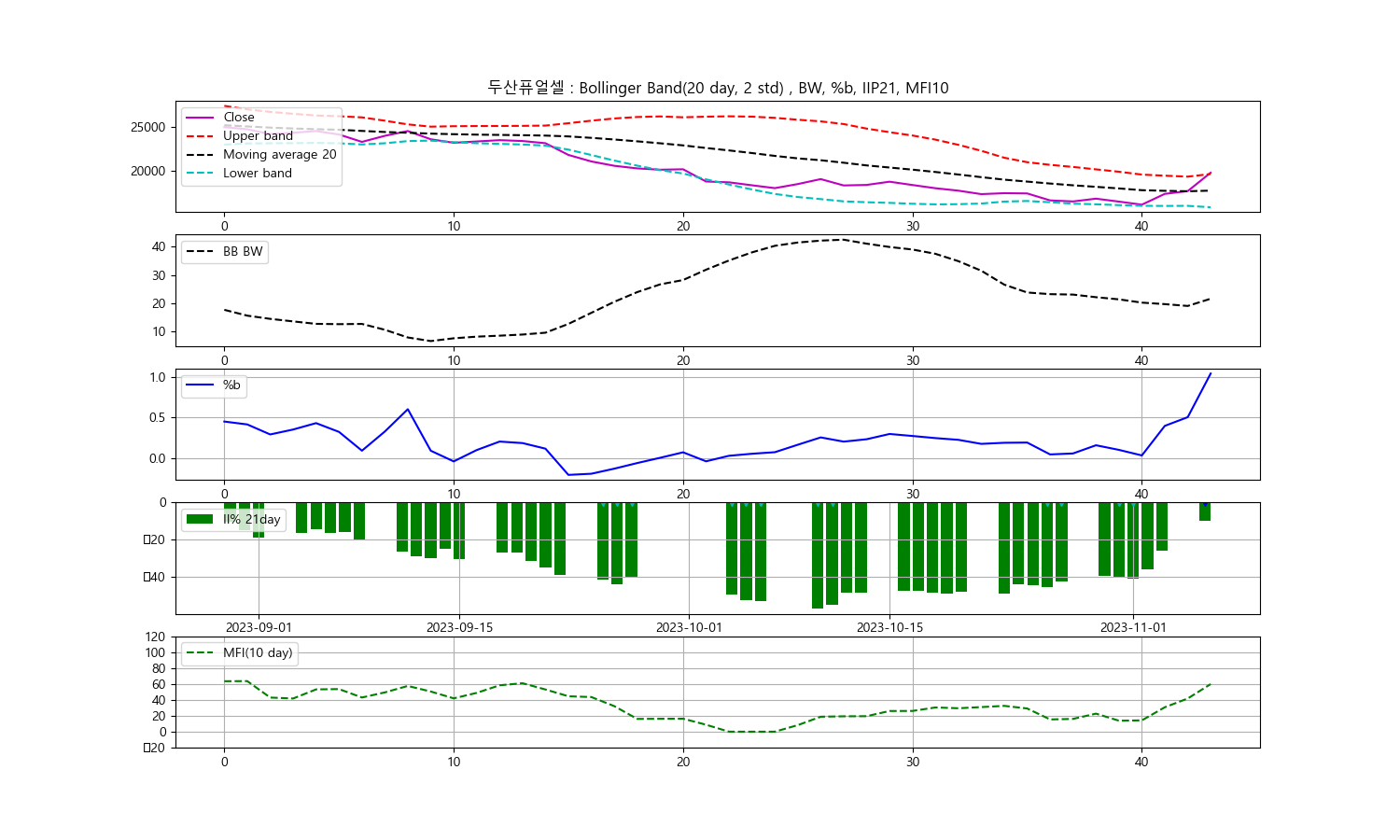 안녕하세요, 블로거 "두부작가"입니다. 오늘은 주식의 종가를 기준으로 볼린저밴드, 일중강도율(IIP), 현금흐름지수(MFI)를 이용한 기술분석에 대해 알아보려고 합니다. 이번에 분석할 데이터는 2023년 11월 6일 두산퓨얼셀의 종가로 기록된 19760입니다. 그럼 본문으로 들어가보겠습니다.
