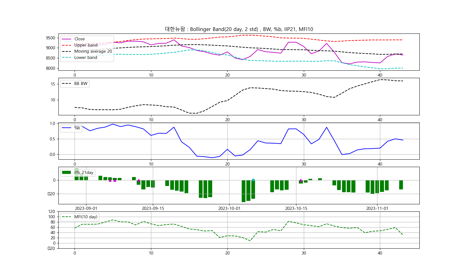 오늘은 대한뉴팜 종목의 주식 기술분석을 제공해드리려고 합니다. 오늘의 데이터는 날짜가 2023년 11월 6일이며, 대한뉴팜 종가는 8650입니다. 우선, 저는 볼린저밴드, 일중강도율, 현금흐름지수를 사용하여 기술분석을 진행하였습니다.