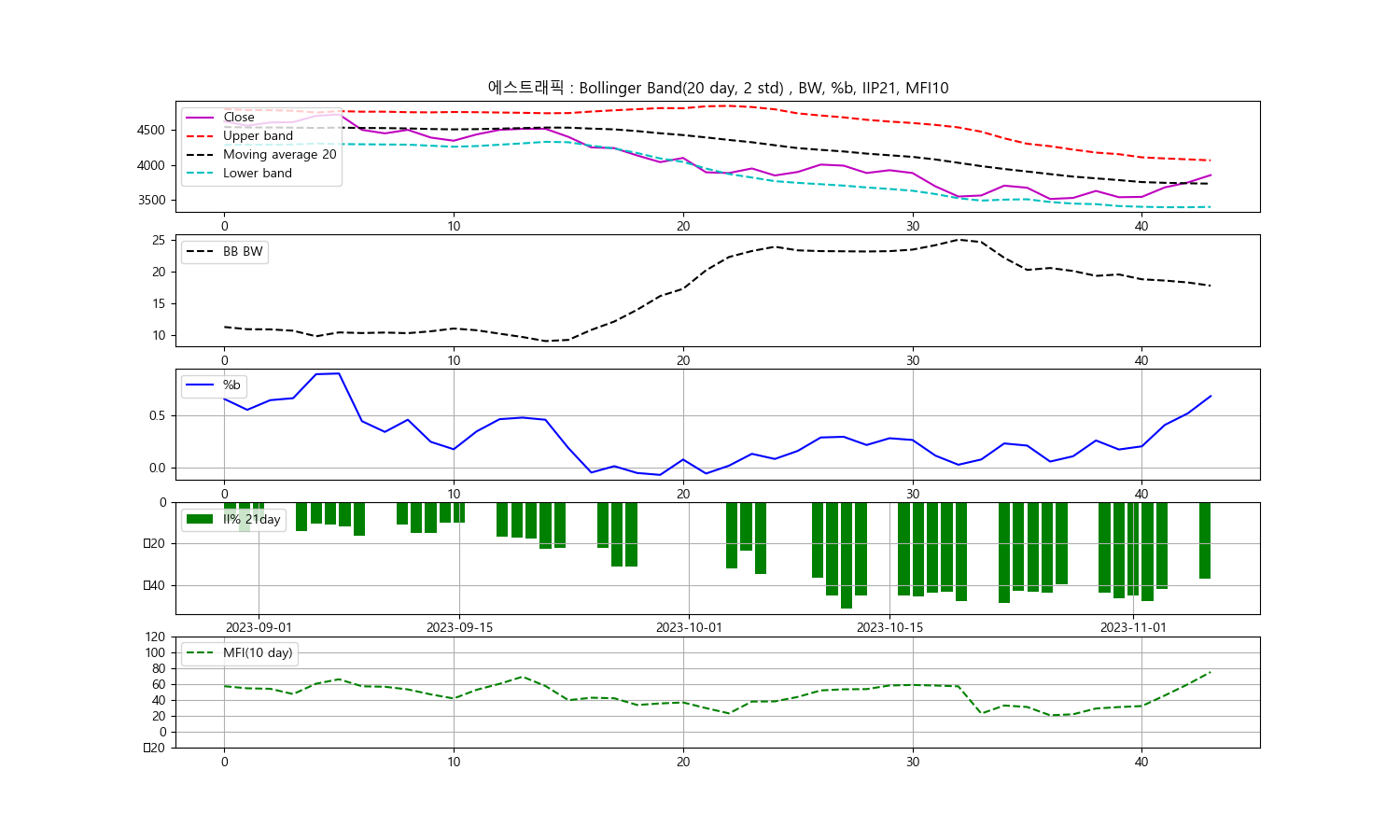 오늘은 주식의 종가를 기준으로 볼린저밴드, 일중강도율(IIP), 현금흐름지수(MFI)를 이용한 기술분석에 대해 알아보겠습니다. 오늘의 데이터는 '날짜:2023-11-06, 종목: 에스트래픽, 종가:3855 볼린저밴드폭:17.75534041352527, 볼린저밴드 %b: 0.6828973901862284, 일중강도율(iip21):-37.15754371700351, 현금흐름지수(MFI):74.86800686089138'입니다.