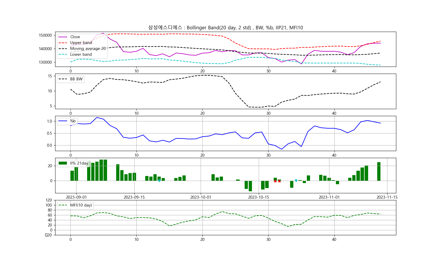 안녕하세요, 두부작가입니다. 오늘은 2023년 11월 14일 기준으로 삼성에스디에스의 주식을 볼린저밴드, 일중강도율(IIP), 현금흐름지수(MFI)를 이용하여 기술적으로 분석해보겠습니다.