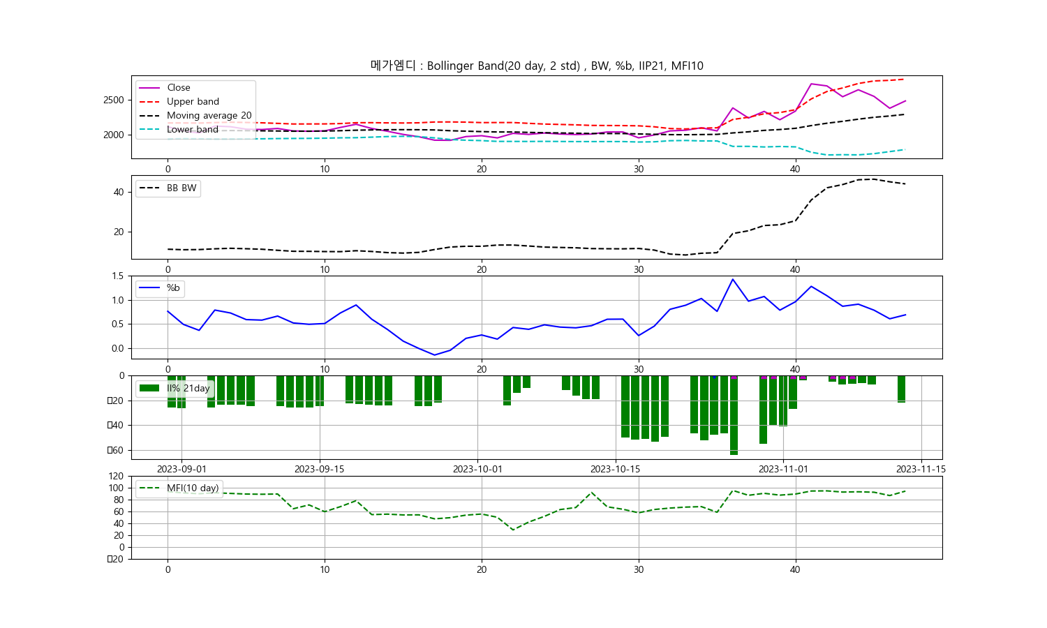 안녕하세요, 두부작가입니다. 오늘은 2023년 11월 14일 기준으로 메가엠디의 주식을 볼린저밴드, 일중강도율(IIP), 현금흐름지수(MFI)를 통해 기술적으로 분석해보겠습니다.