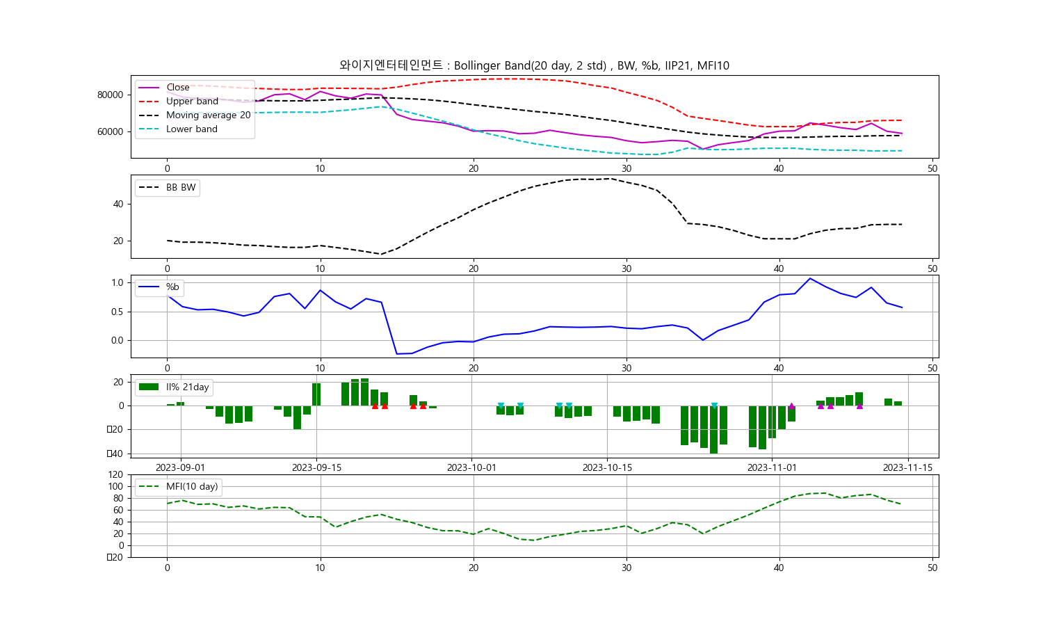 볼린저밴드, 일중강도율, 현금흐름지수를 종합적으로 고려할 때, 와이지엔터테인먼트는 현재 중간 수준의 변동성을 유지하고 있으며, 거래 강도는 낮지만 자금의 유입이 있어 상대적으로 안정된 상태로 보입니다. 그러나 향후 주가의 움직임은 변동성을 주의 깊게 지켜보아야 할 것으로 판단됩니다.
