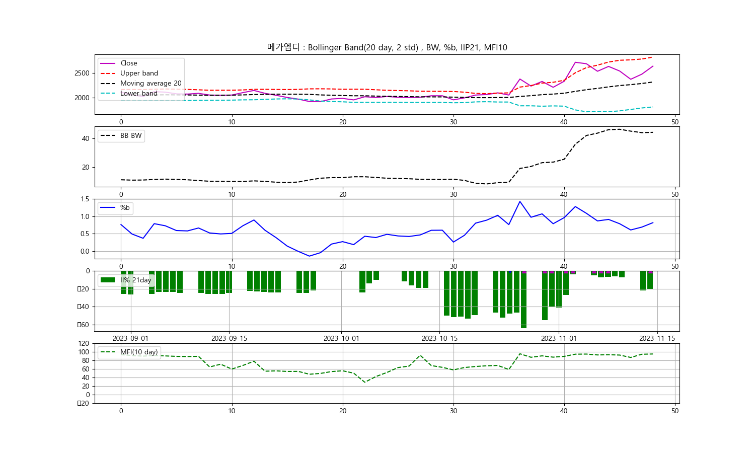 안녕하세요, 두부작가입니다. 오늘은 메가엠디 주식에 대한 기술적 분석을 통해 매수 타이밍을 알아보려고 합니다. 이번 분석에서는 주식의 종가를 기준으로 볼린저밴드, 일중강도율(IIP), 그리고 현금흐름지수(MFI)를 살펴보겠습니다. 본 분석의 데이터는 2023년 11월 14일 기준으로 메가엠디 종목의 종가가 2,645원인 상황입니다.
