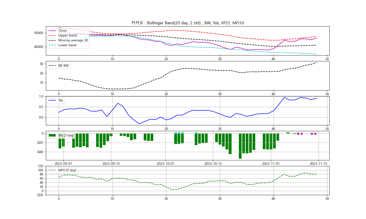 안녕하세요, 두부작가입니다. 오늘은 카카오 주식에 대한 기술적 분석을 통해 매수 타이밍을 알아보려고 합니다. 이번 분석에서는 주식의 종가를 기준으로 볼린저밴드, 일중강도율(IIP), 그리고 현금흐름지수(MFI)를 살펴보겠습니다. 본 분석의 데이터는 2023년 11월 14일 기준으로 카카오 종목의 종가가 46,350원인 상황입니다.
