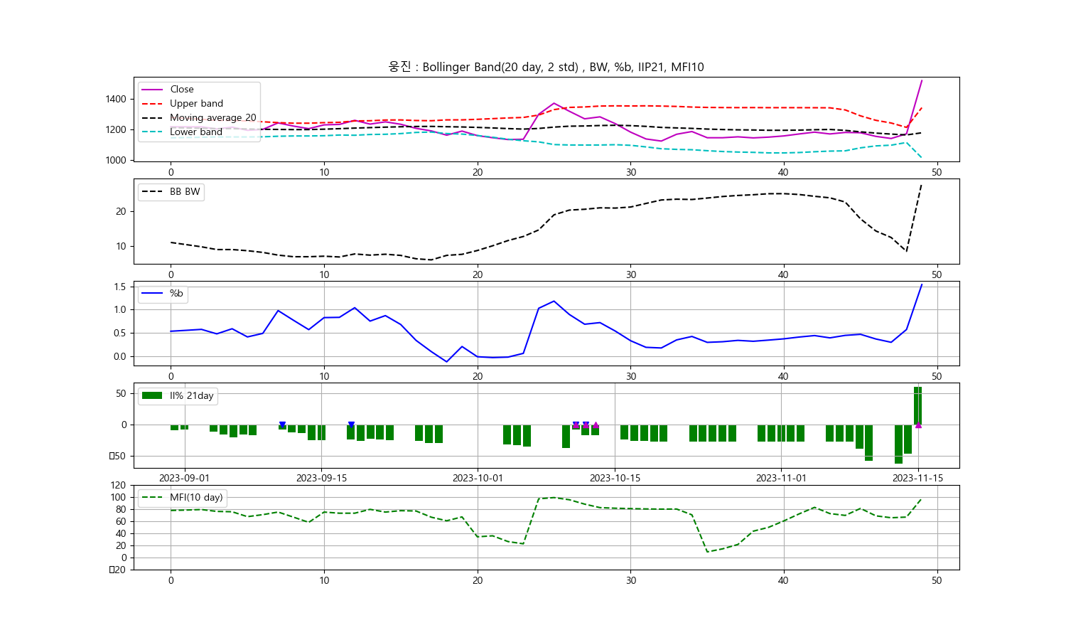 안녕하세요, 두부작가입니다. 오늘은 2023년 11월 15일 기준으로 웅진의 주가에 대한 기술분석을 진행해 보겠습니다. 이번 포스트에서는 주식의 종가를 기준으로 볼린저밴드, 일중강도율(IIP), 현금흐름지수(MFI)를 활용하여 추세 및 매매 타이밍을 분석해보려 합니다.