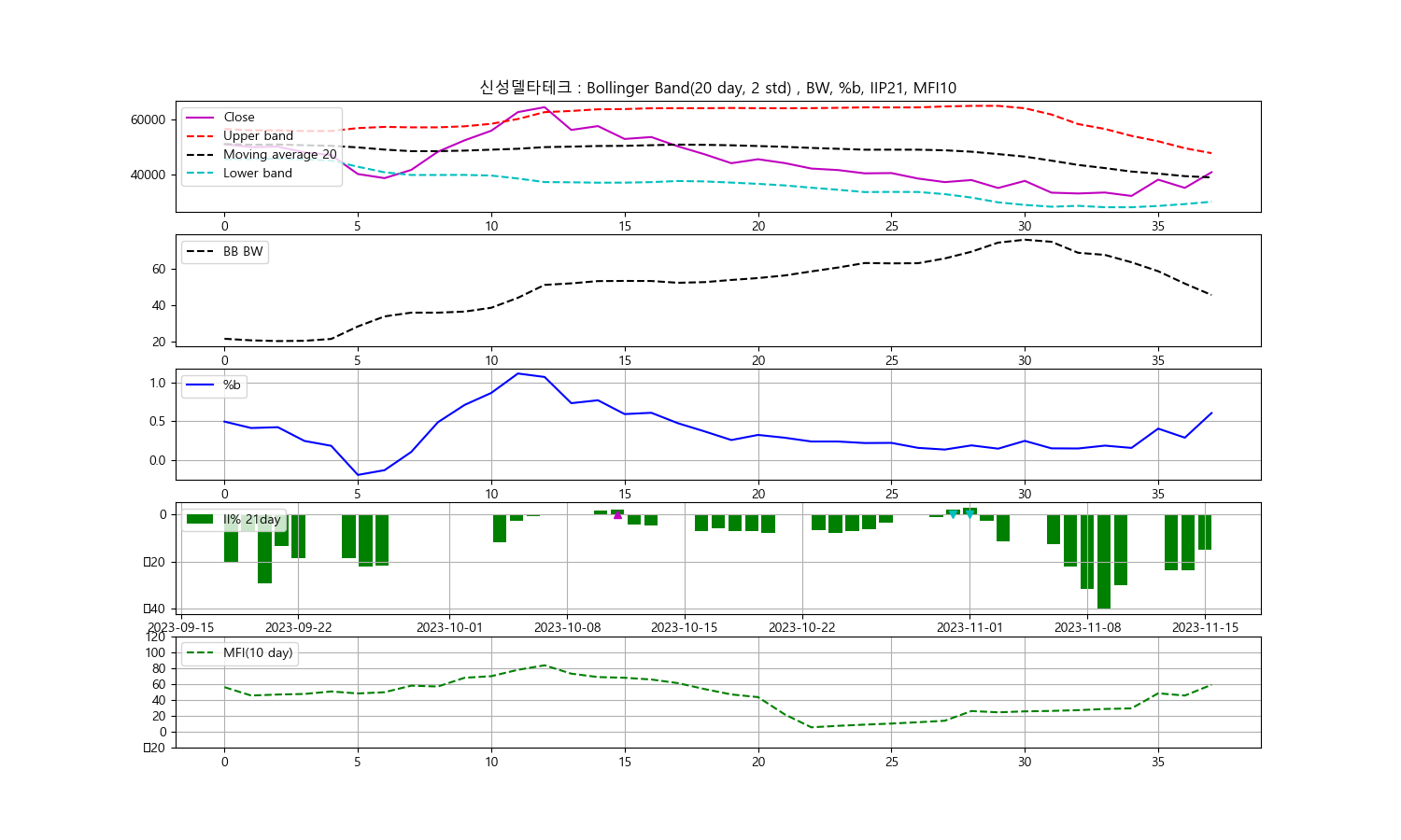 안녕하세요, 두부작가입니다. 오늘은 2023년 11월 15일을 기준으로 신성델타테크 종목에 대한 주식 기술분석을 진행해보려고 합니다. 주가의 종가를 중심으로 볼린저밴드, 일중강도율(IIP), 현금흐름지수(MFI)를 살펴봄으로써 어떠한 추세를 파악할 수 있는지 살펴보겠습니다.
