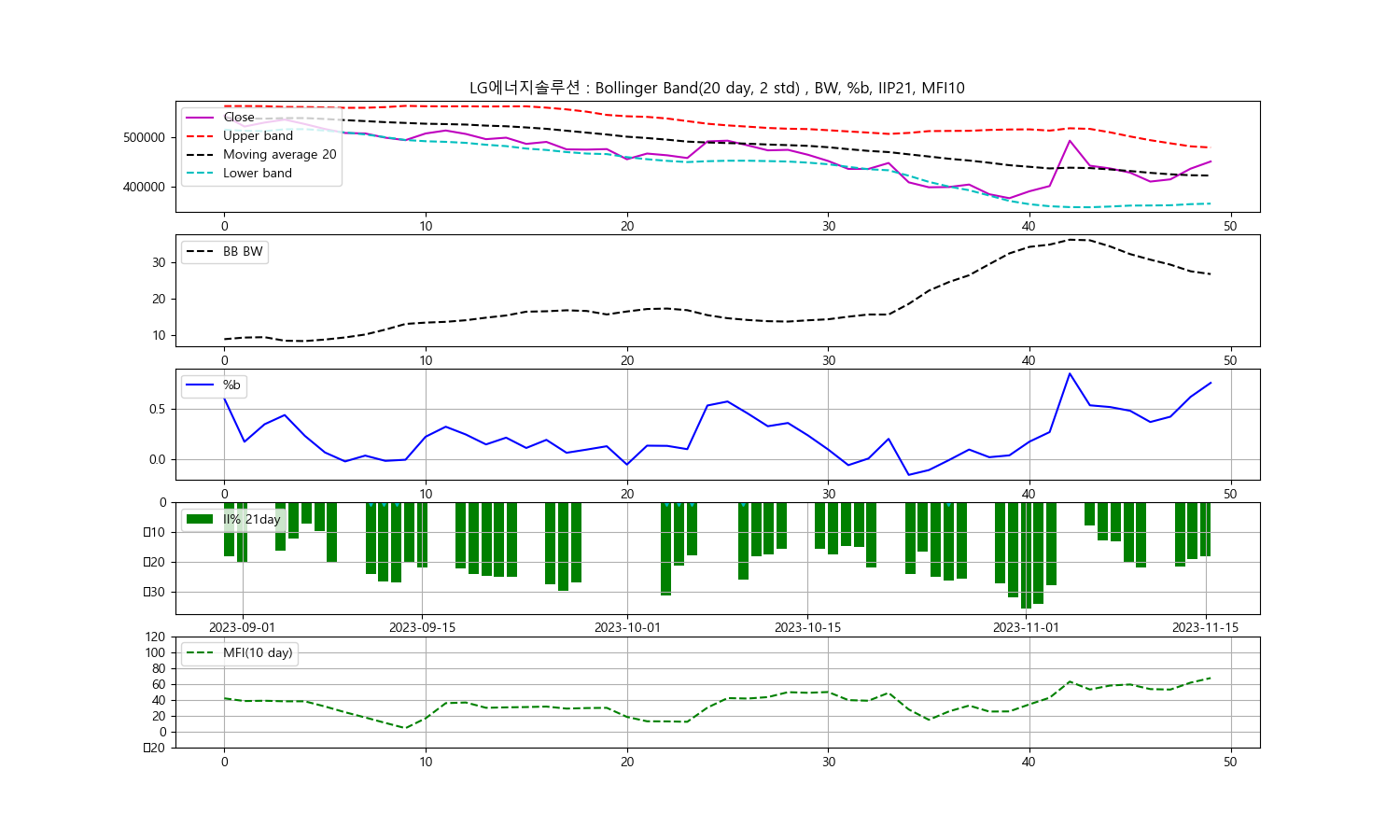 안녕하세요, 두부작가입니다. 오늘은 LG에너지솔루션의 주가에 대한 기술분석을 제공하려고 합니다. 이번에 사용할 지표들은 볼린저밴드, 일중강도율(IIP), 현금흐름지수(MFI)입니다. 이러한 기술적 분석을 통해 주식 투자에 참고할 만한 가치있는 정보들을 얻을 수 있습니다.
