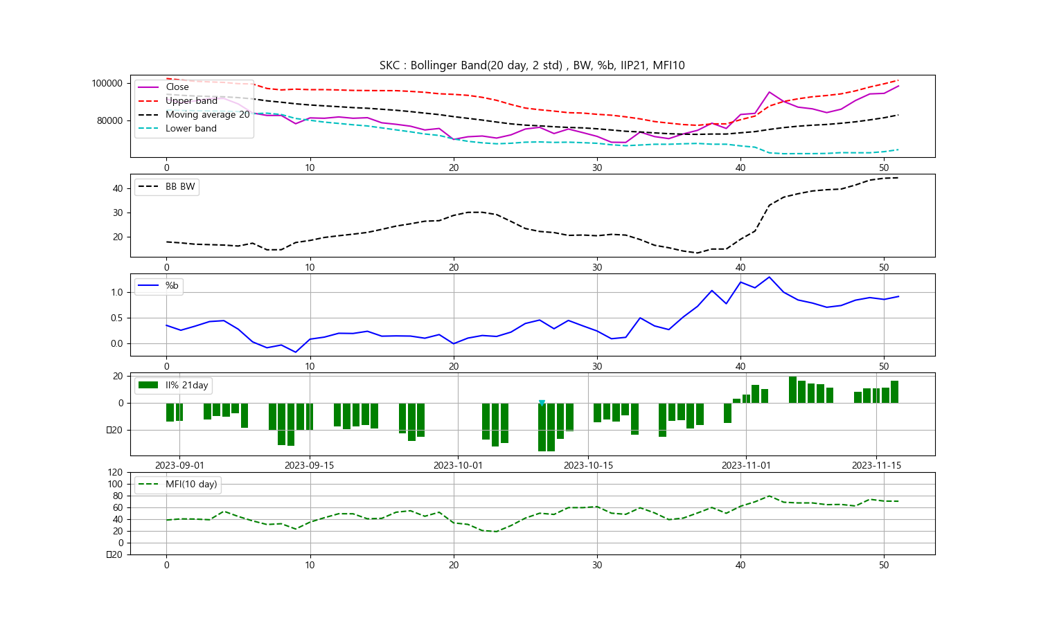 안녕하세요, 두부작가입니다. 오늘은 2023년 11월 17일을 기준으로 SKC 종목의 기술분석을 진행해보려고 합니다. 주가 분석은 여러 지표를 활용하여 향후 주가 움직임을 예측하는 데 도움이 됩니다. 오늘은 볼린저밴드, 일중강도율(IIP), 그리고 현금흐름지수(MFI)에 주목하여 분석을 진행해보겠습니다.