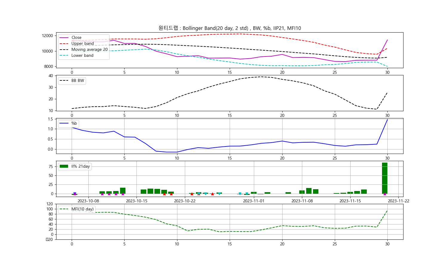안녕하세요, 두부작가입니다. 오늘은 2023년 11월 20일을 기준으로 한 주식 기술분석을 통해 원티드랩의 투자 전망을 살펴보려고 합니다. 이번 분석에서는 주식의 종가를 중심으로 볼린저밴드, 일중강도율(IIP), 현금흐름지수(MFI)를 사용하여 매수 타이밍을 확인해보겠습니다.