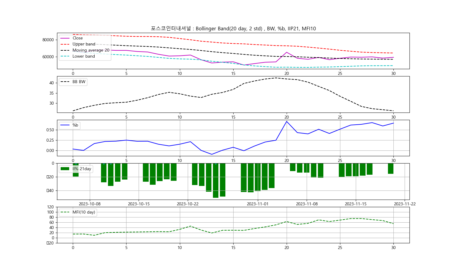 안녕하세요, 두부작가입니다. 오늘은 2023년 11월 20일을 기준으로 포스코인터내셔널 주식에 대한 기술분석을 진행해보겠습니다. 주요 지표로는 주식의 종가를 기준으로 한 볼린저밴드, 일중강도율(IIP), 현금흐름지수(MFI)를 활용하여 향후 투자 전망을 살펴보겠습니다.