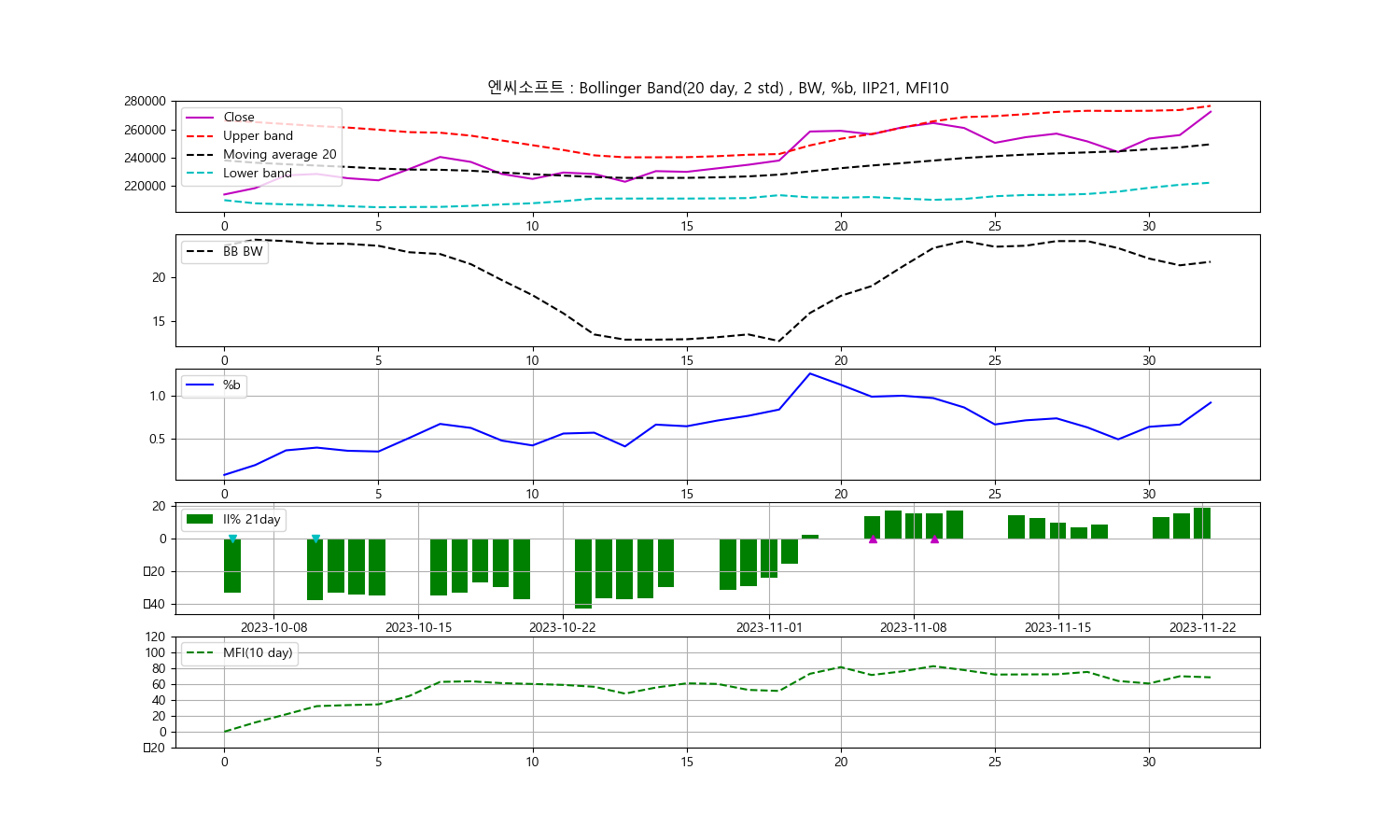 안녕하세요, 두부작가입니다. 오늘은 2023년 11월 22일을 기준으로 엔씨소프트 주식에 대한 기술분석을 진행해보겠습니다. 이번 분석에서는 주식의 종가를 중심으로 한 볼린저밴드, 일중강도율(IIP), 현금흐름지수(MFI)를 활용하여 향후 투자 전망을 살펴보겠습니다.