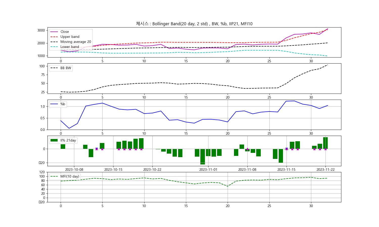 안녕하세요, 두부작가입니다. 오늘은 2023년 11월 22일을 기준으로 한 체시스 주식에 대한 기술분석을 진행해보겠습니다. 이번 분석에서는 주식의 종가를 중심으로 한 볼린저밴드, 일중강도율(IIP), 현금흐름지수(MFI)를 활용하여 향후 투자 전망을 살펴보겠습니다.