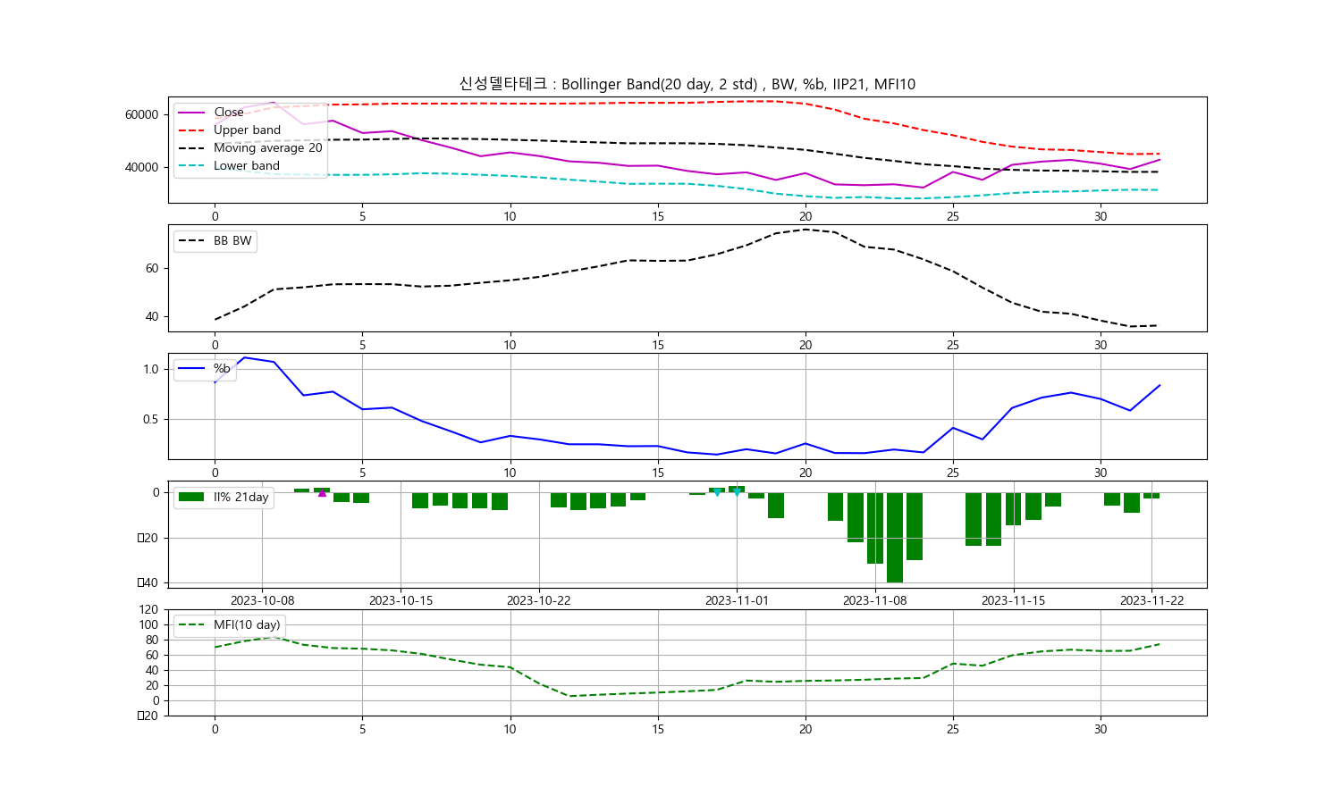 안녕하세요, 두부작가입니다. 오늘은 2023년 11월 22일을 기준으로 한 신성델타테크 주식에 대한 기술분석을 진행해보겠습니다. 이번 분석에서는 주식의 종가를 중심으로 한 볼린저밴드, 일중강도율(IIP), 현금흐름지수(MFI)를 활용하여 향후 투자 전망을 살펴보겠습니다.