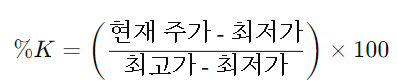 - 최근 일정 기간(일반적으로 14일) 동안의 주가 범위에서 현재 주가가 어디에 위치하는지를 백분율로 나타냅니다.