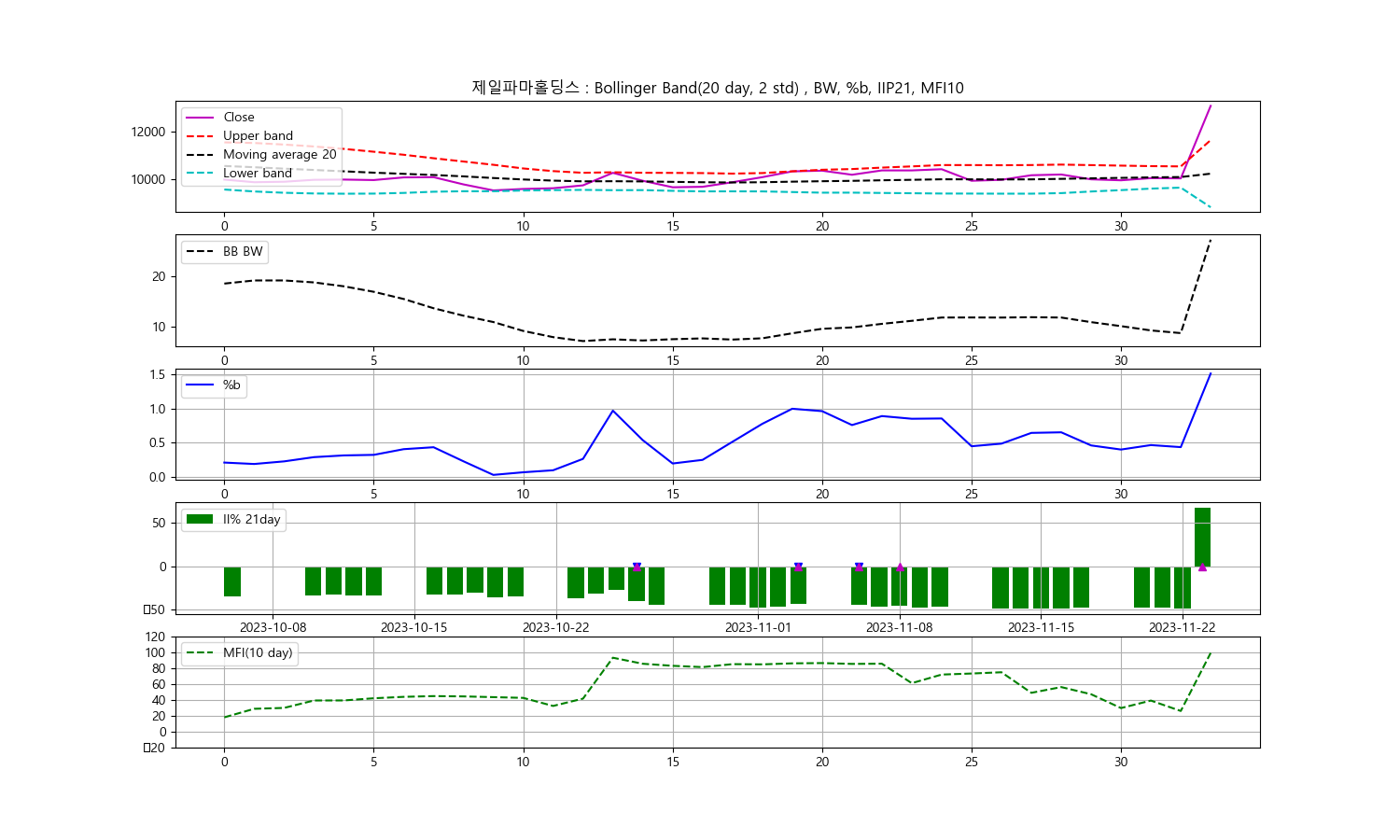 안녕하세요, 두부작가입니다. 오늘은 2023년 11월 23일을 기준으로 한 제일파마홀딩스 주식에 대한 기술분석을 진행해보겠습니다. 이번 분석에서는 주식의 종가를 중심으로 한 볼린저밴드, 일중강도율(IIP), 현금흐름지수(MFI)를 활용하여 향후 투자 전망을 살펴보겠습니다.