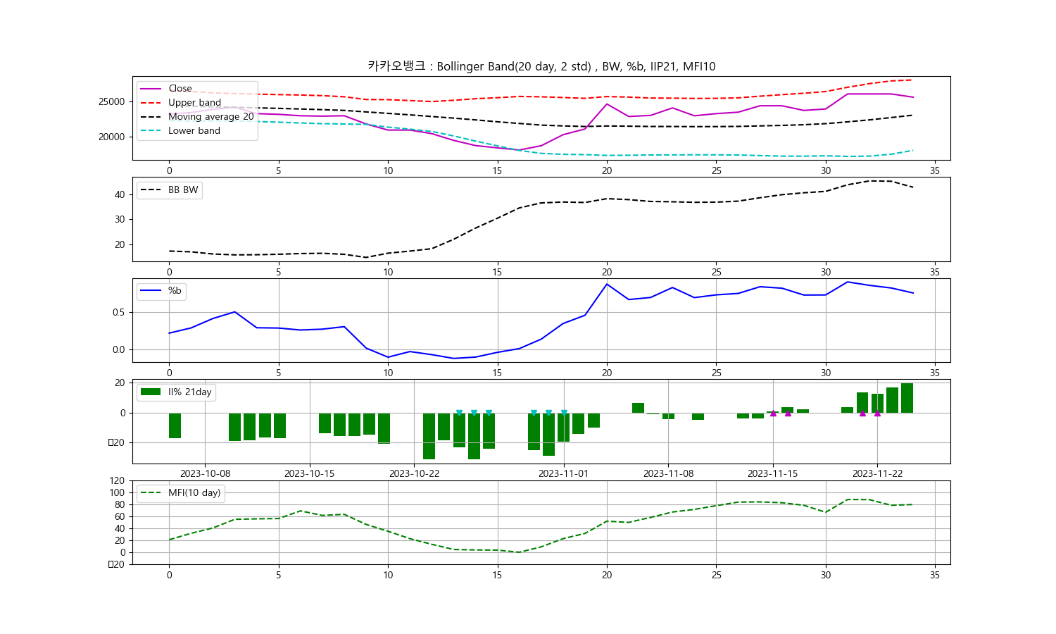 안녕하세요, 두부작가입니다. 오늘은 2023년 11월 24일을 기준으로 한 카카오뱅크 주식에 대한 기술분석을 진행해보겠습니다. 주식의 종가를 중심으로 한 볼린저밴드, 일중강도율(IIP), 현금흐름지수(MFI)를 통해 향후 투자 전망을 알아보겠습니다.