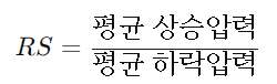 - RS(Relative Strength)는 평균 상승압력과 평균 하락압력의 비율을 나타내며, 다음과 같이 계산됩니다.