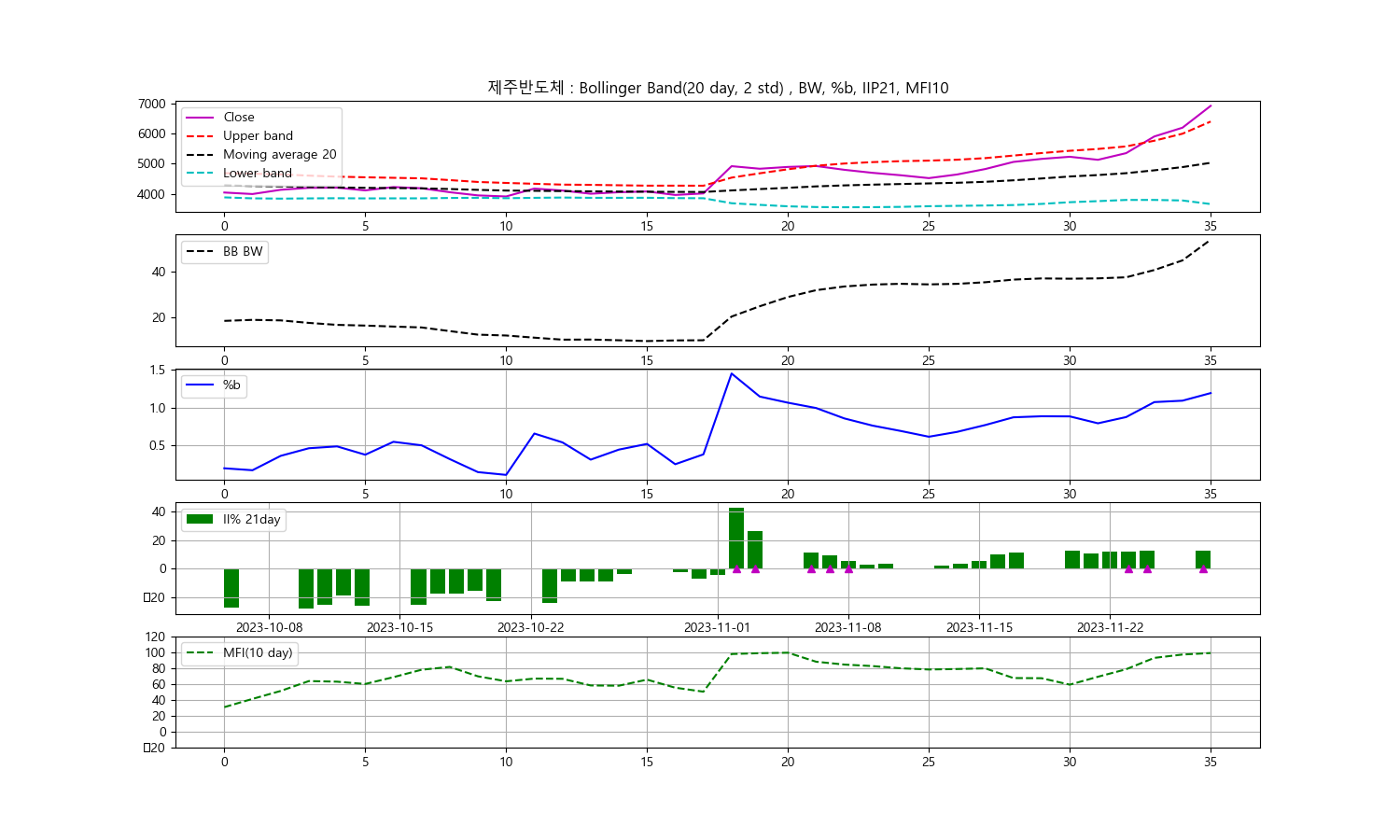 안녕하세요, 두부작가입니다. 오늘은 2023년 11월 27일을 기준으로 한 제주반도체 주식에 대한 기술분석을 진행해보겠습니다. 주식의 종가를 중심으로 한 볼린저밴드, 일중강도율(IIP), 현금흐름지수(MFI)를 통해 향후 투자 동향을 알아보겠습니다.