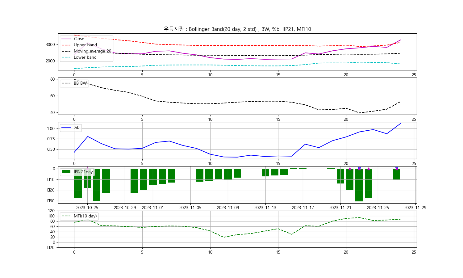 안녕하세요, 두부작가입니다. 오늘은 2023년 11월 27일을 기준으로 한 우듬지팜 주식에 대한 기술분석을 진행해보겠습니다. 주식의 종가를 중심으로 한 볼린저밴드, 일중강도율(IIP), 현금흐름지수(MFI)를 통해 향후 투자 동향을 알아보겠습니다.