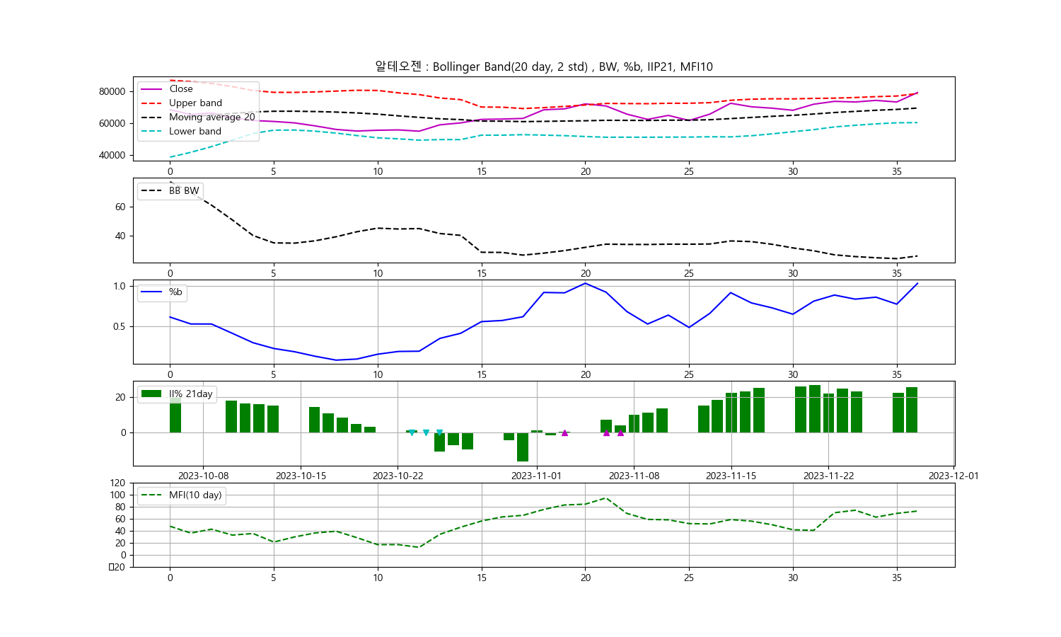 안녕하세요, 두부작가입니다. 오늘은 2023년 11월 28일을 기준으로 한 알테오젠 주식에 대한 기술분석을 진행해보겠습니다. 주식의 종가를 중심으로 한 볼린저밴드, 일중강도율(IIP), 현금흐름지수(MFI)를 통해 향후 투자 동향을 알아보겠습니다.