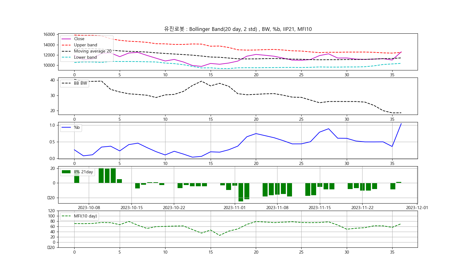 안녕하세요, 두부작가입니다. 오늘은 2023년 11월 28일을 기준으로 한 유진로봇 주식에 대한 기술분석을 진행해보겠습니다. 주식의 종가를 중심으로 한 볼린저밴드, 일중강도율(IIP), 현금흐름지수(MFI)를 통해 향후 투자 동향을 알아보겠습니다.
