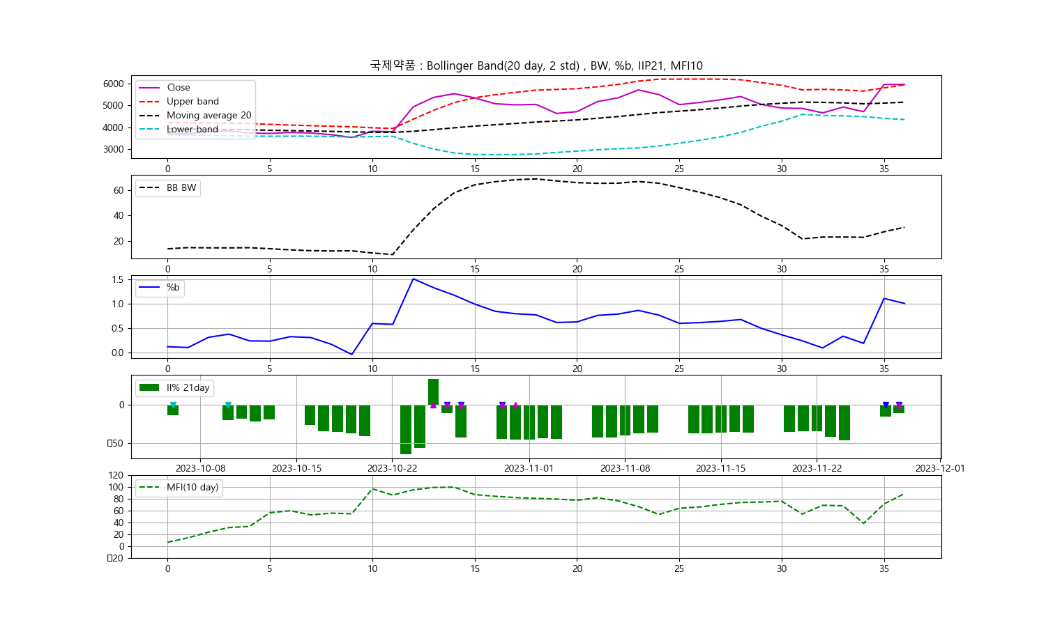 안녕하세요, 두부작가입니다. 오늘은 2023년 11월 28일을 기준으로 한 국제약품 주식에 대한 기술분석을 진행해보겠습니다. 주식의 종가를 중심으로 한 볼린저밴드, 일중강도율(IIP), 현금흐름지수(MFI)를 통해 향후 투자 동향을 알아보겠습니다.