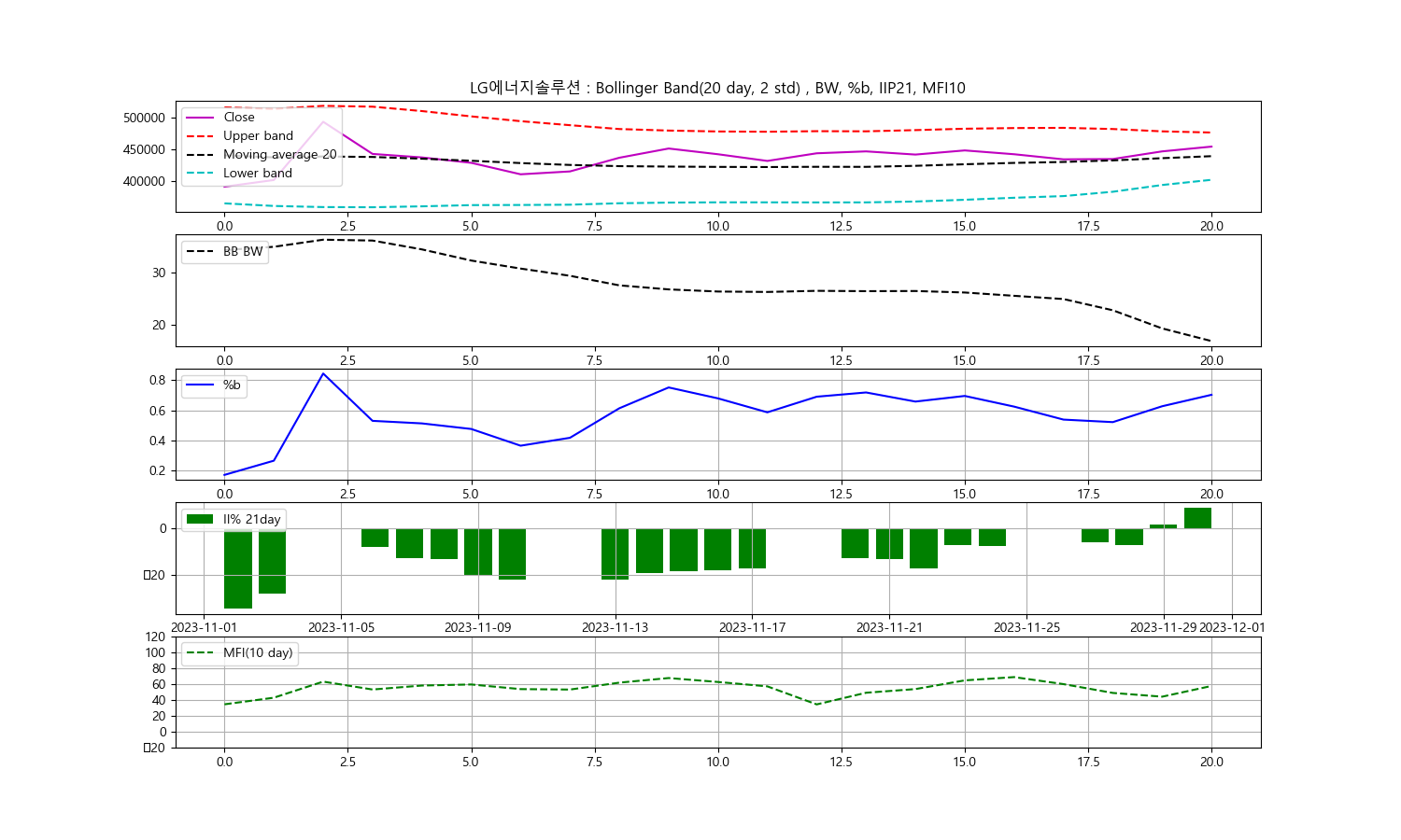 안녕하세요, 두부작가입니다. 오늘은 2023년 11월 30일을 기준으로 한 LG에너지솔루션 주식에 대한 기술분석을 진행해보겠습니다. 주식의 종가를 중심으로 한 볼린저밴드, 일중강도율(IIP), 현금흐름지수(MFI)를 통해 향후 투자 동향을 알아보겠습니다.