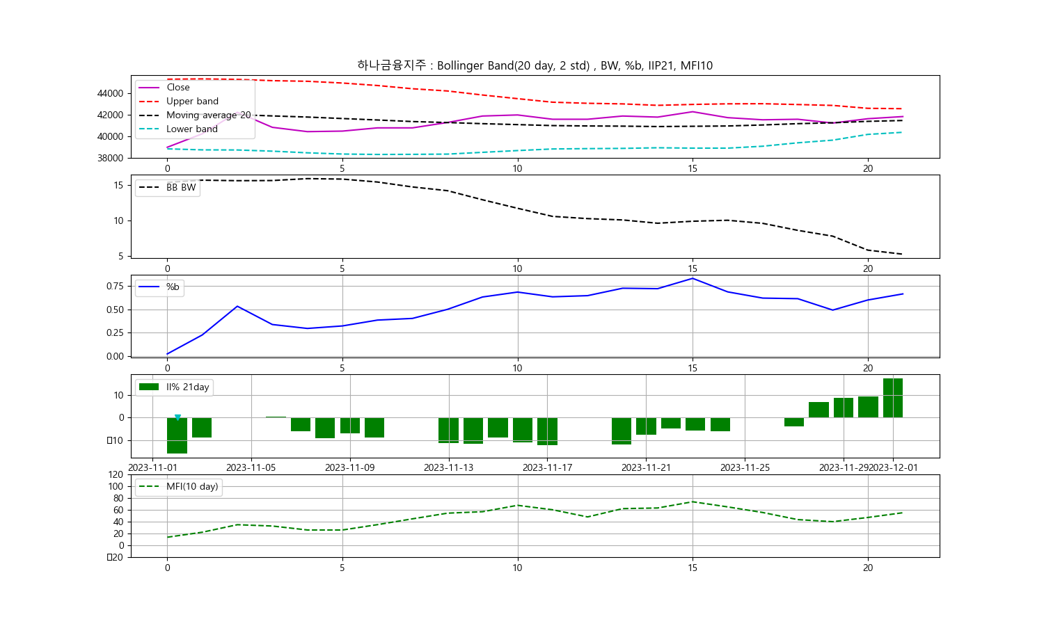 안녕하세요, 두부작가입니다. 오늘은 2023년 12월 1일을 기준으로 한 하나금융지주 주식에 대한 기술분석을 진행해보겠습니다. 주식의 종가를 중심으로 한 볼린저밴드, 일중강도율(IIP), 현금흐름지수(MFI)를 통해 향후 투자 동향을 알아보겠습니다.