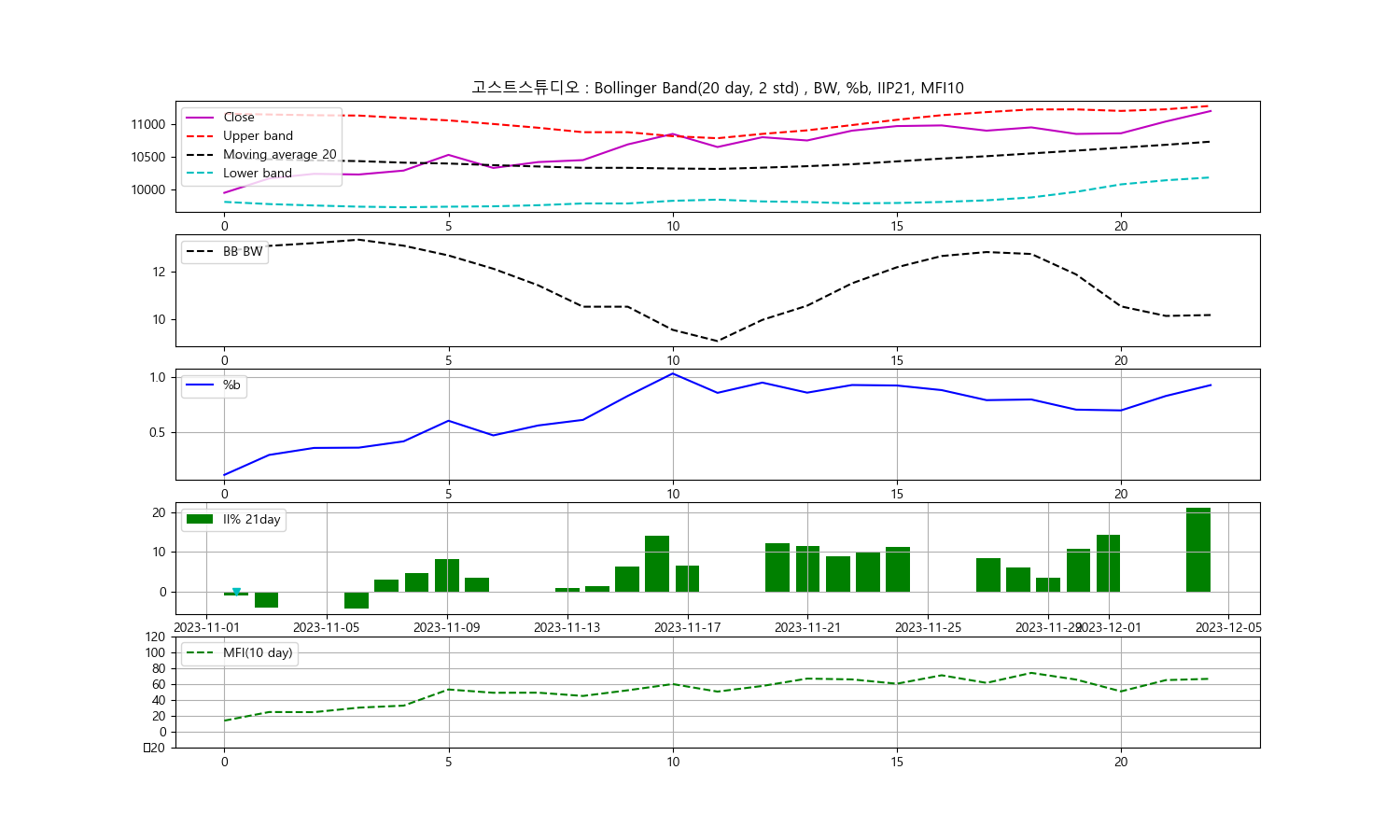 안녕하세요, 두부작가입니다. 오늘은 2023년 12월 5일을 기준으로 한 고스트스튜디오 주식에 대한 기술분석을 진행해보겠습니다. 주식의 종가를 중심으로 한 볼린저밴드, 일중강도율(IIP), 현금흐름지수(MFI)를 통해 향후 투자 동향을 알아보겠습니다.