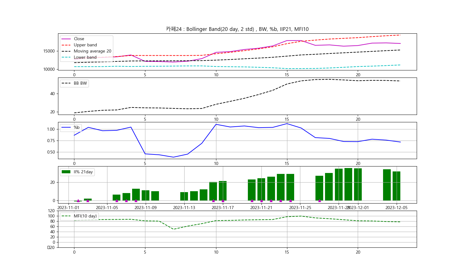 안녕하세요, 두부작가입니다. 오늘은 2023년 12월 6일을 기준으로 한 카페24 주식에 대한 기술분석을 진행해보겠습니다. 주식의 종가를 중심으로 한 볼린저밴드, 일중강도율(IIP), 현금흐름지수(MFI)를 통해 향후 투자 동향을 알아보겠습니다.