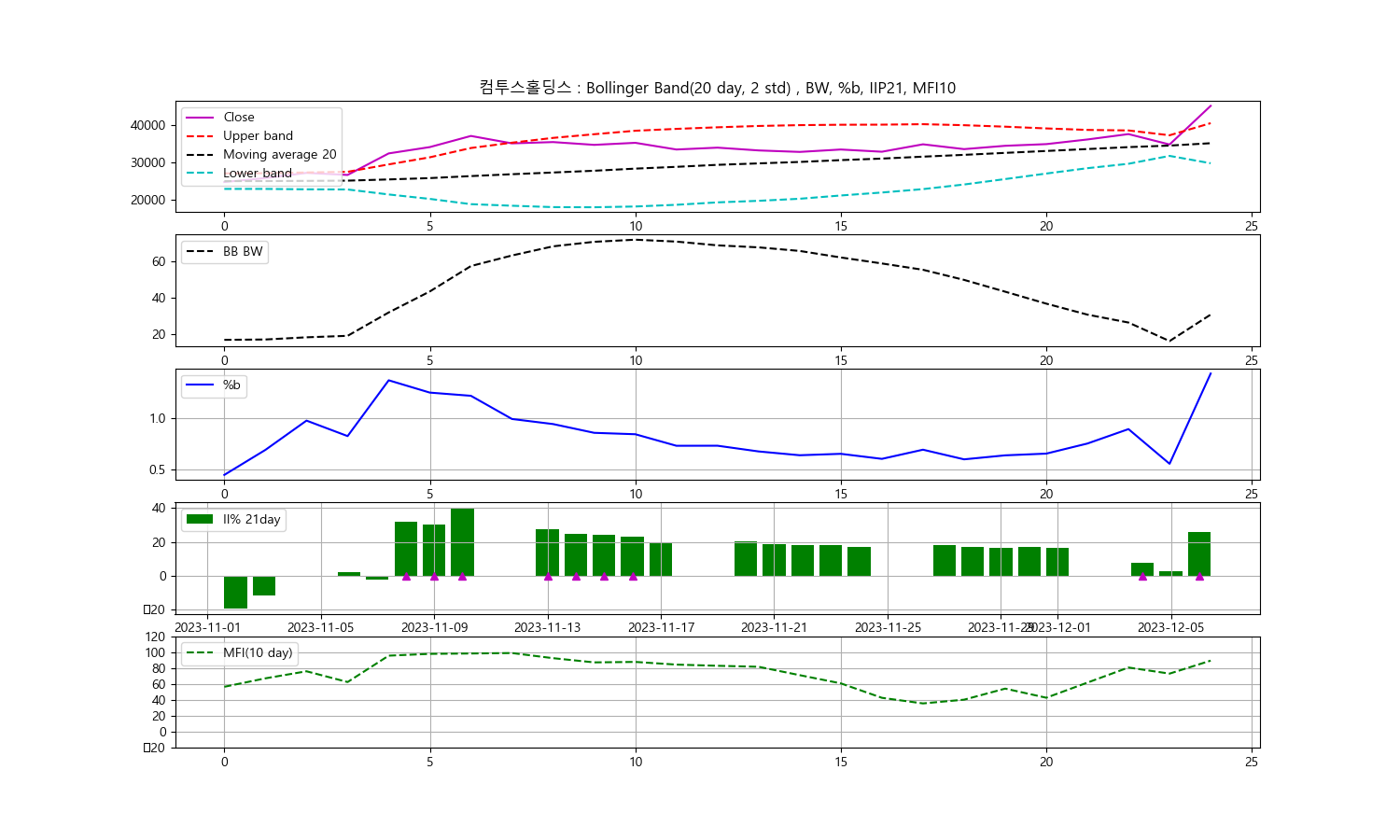 안녕하세요, 두부작가입니다. 오늘은 2023년 12월 6일을 기준으로 한 컴투스홀딩스 주식에 대한 기술분석을 진행해보겠습니다. 주식의 종가를 중심으로 한 볼린저밴드, 일중강도율(IIP), 현금흐름지수(MFI)를 통해 향후 투자 동향을 알아보겠습니다.