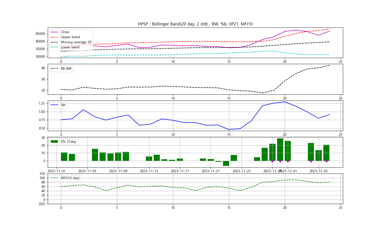 안녕하세요, 두부작가입니다. 오늘은 2023년 12월 6일을 기준으로 한 HPSP 주식에 대한 기술분석을 진행해보겠습니다. 주식의 종가를 중심으로 한 볼린저밴드, 일중강도율(IIP), 현금흐름지수(MFI)를 통해 향후 투자 동향을 알아보겠습니다.