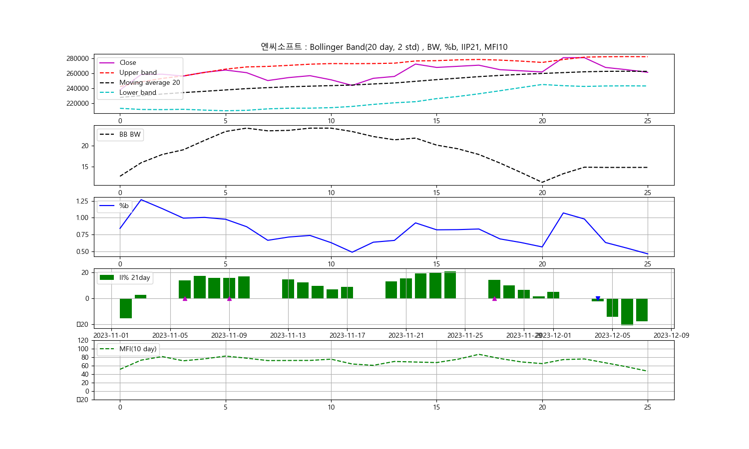안녕하세요, 두부작가입니다. 오늘은 2023년 12월 8일을 기준으로 한 엔씨소프트 주식에 대한 기술분석을 진행해보겠습니다. 주식의 종가를 중심으로 한 볼린저밴드, 일중강도율(IIP), 현금흐름지수(MFI)를 통해 향후 투자 동향을 알아보겠습니다.