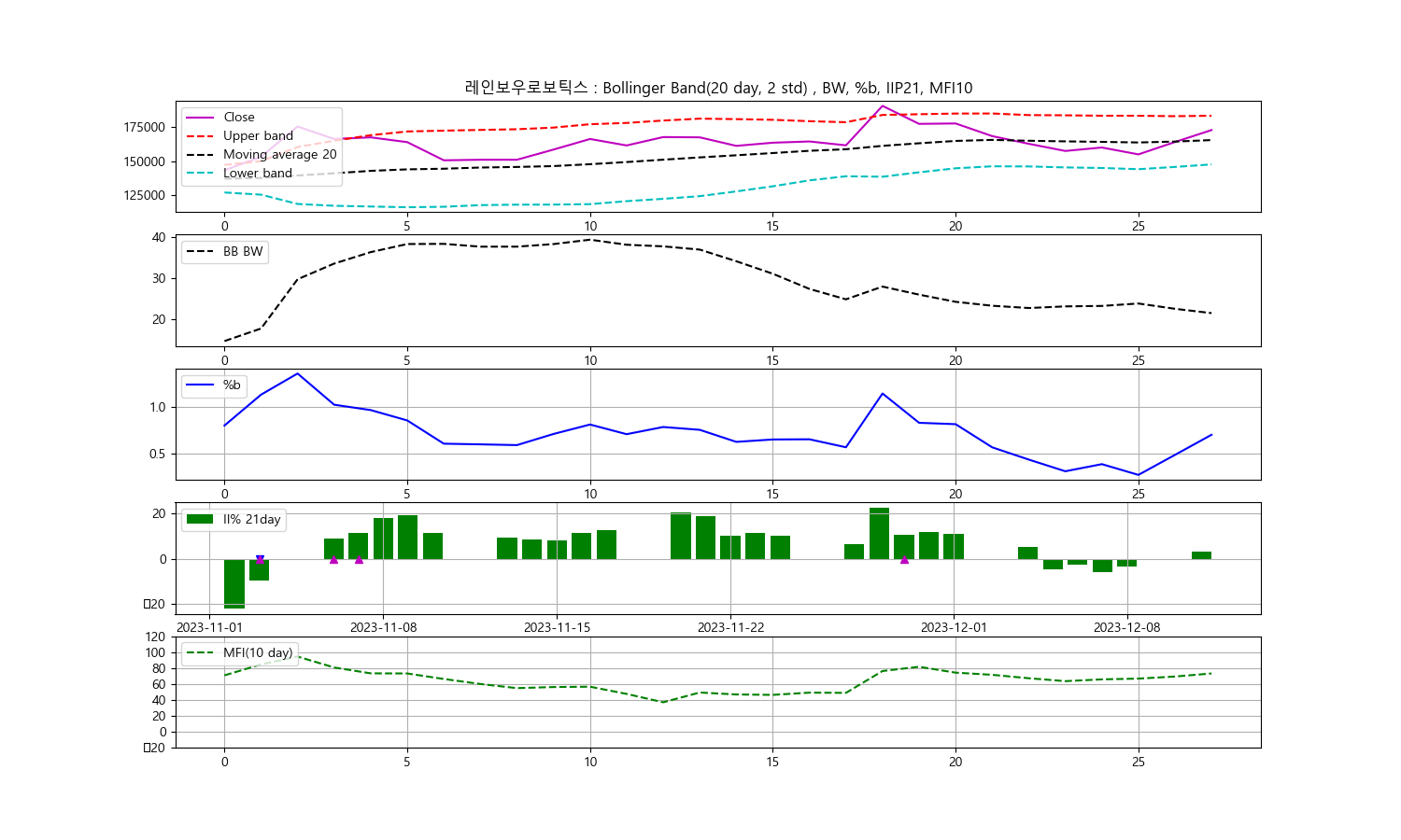 안녕하세요, 두부작가입니다. 오늘은 2023년 12월 11일을 기준으로 한 레인보우로보틱스 주식에 대한 기술분석을 진행해보겠습니다. 주식의 종가를 중심으로 한 볼린저밴드, 일중강도율(IIP), 현금흐름지수(MFI)를 통해 향후 투자 동향을 알아보겠습니다.