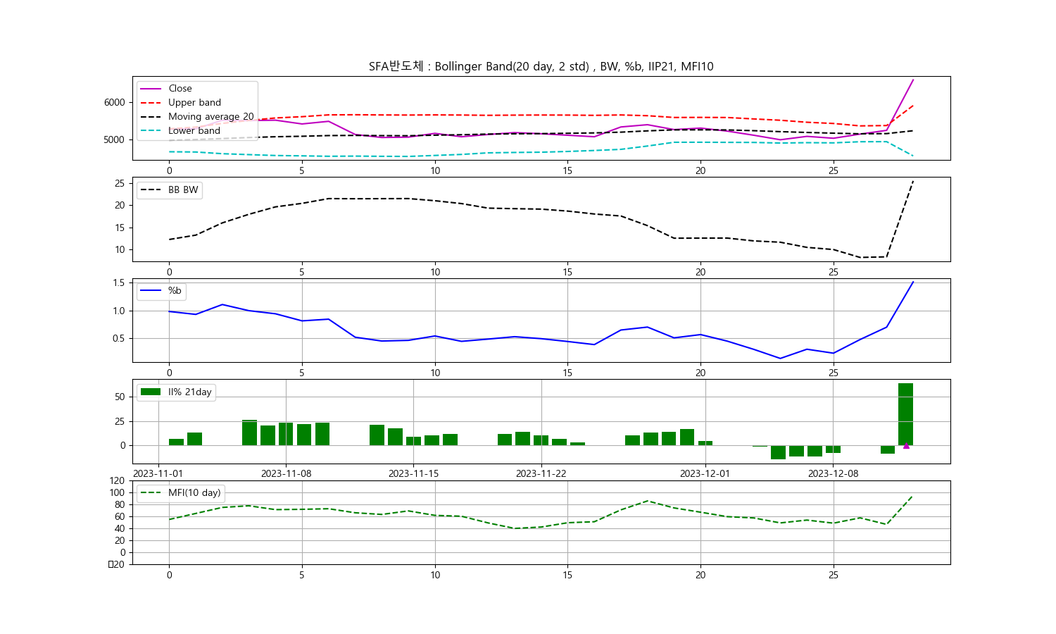 안녕하세요, 두부작가입니다. 오늘은 2023년 12월 12일을 기준으로 한 SFA반도체 주식에 대한 기술분석을 진행해보겠습니다. 주식의 종가를 중심으로 한 볼린저밴드, 일중강도율(IIP), 현금흐름지수(MFI)를 통해 향후 투자 동향을 알아보겠습니다.