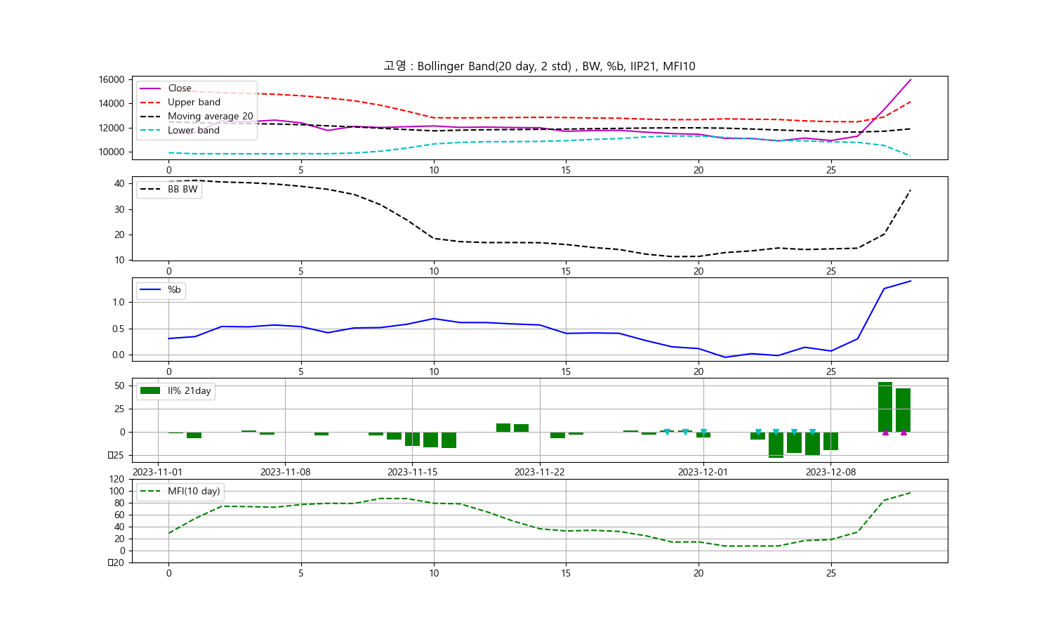 안녕하세요, 두부작가입니다. 오늘은 2023년 12월 12일을 기준으로 한 고영 주식에 대한 기술분석을 진행해보겠습니다. 주식의 종가를 중심으로 한 볼린저밴드, 일중강도율(IIP), 현금흐름지수(MFI)를 통해 향후 투자 동향을 알아보겠습니다.