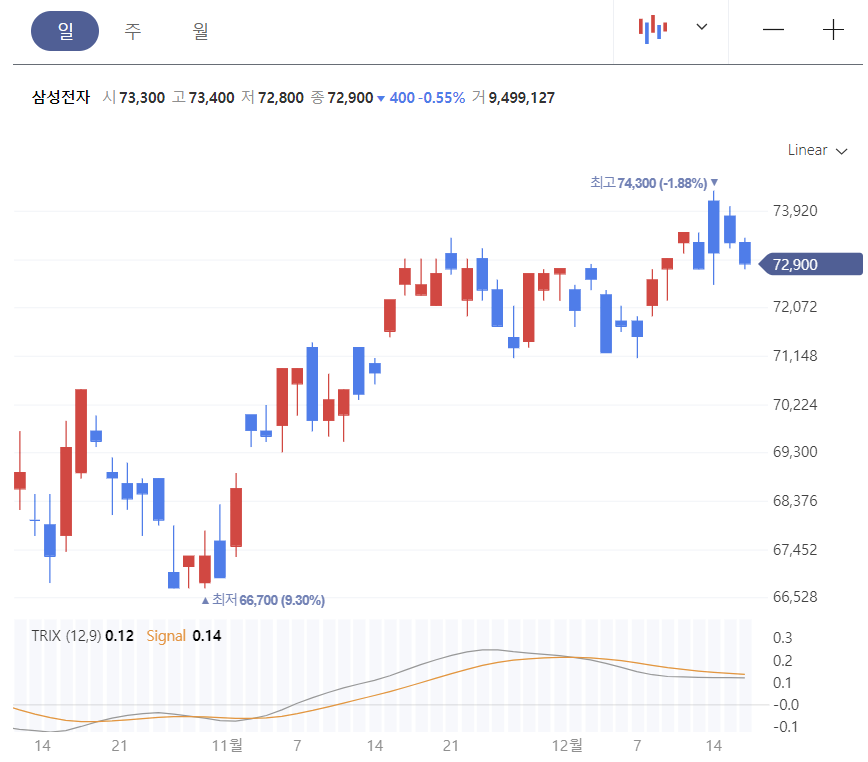 - 주가가 새로운 고점을 형성하면서 TRIX가 고점을 형성하지 않거나 반대로 주가가 새로운 저점을 형성하면서 TRIX가 낮은 점을 형성할 경우, 이는 추세 반전의 조짐일 수 있습니다.