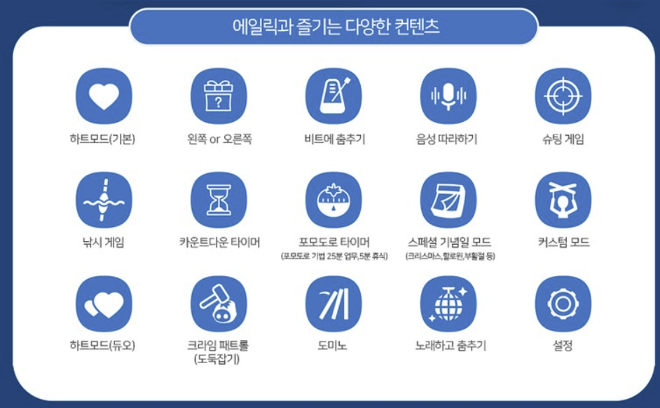 에일릭 로봇은 13가지 모드를 제공해요. 이 모드에는 대화 모드, 놀이 모드, 음악 모드 등 다양한 옵션이 포함되어 있어요. 각 모드에서는 로봇이 다양한 활동을 할 수 있고, 사용자와 재미있는 상호작용을 즐길 수 있답니다. 예를 들어, 놀이 모드에서는 로봇과 함께 간단한 게임을 할 수 있어요!