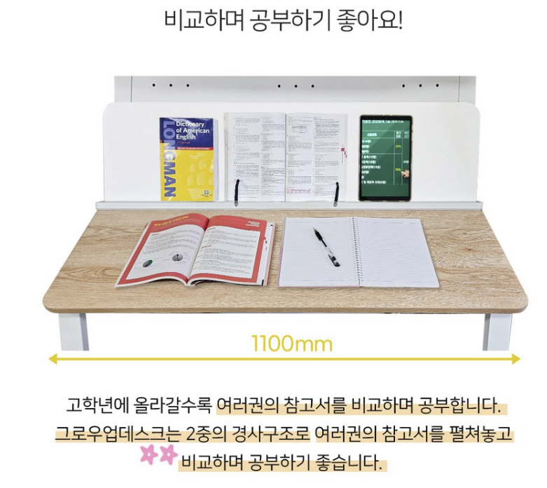그로우업데스크의 대형독서대는 책을 읽거나 숙제를 할 때 큰 도움이 됩니다. 책을 놓을 수 있는 공간이 넉넉해서, 여러 권의 책을 동시에 놓고 공부할 수 있어요. 또한 독서대는 각도 조절이 가능해 아이가 편한 자세로 책을 읽을 수 있도록 도와줍니다.