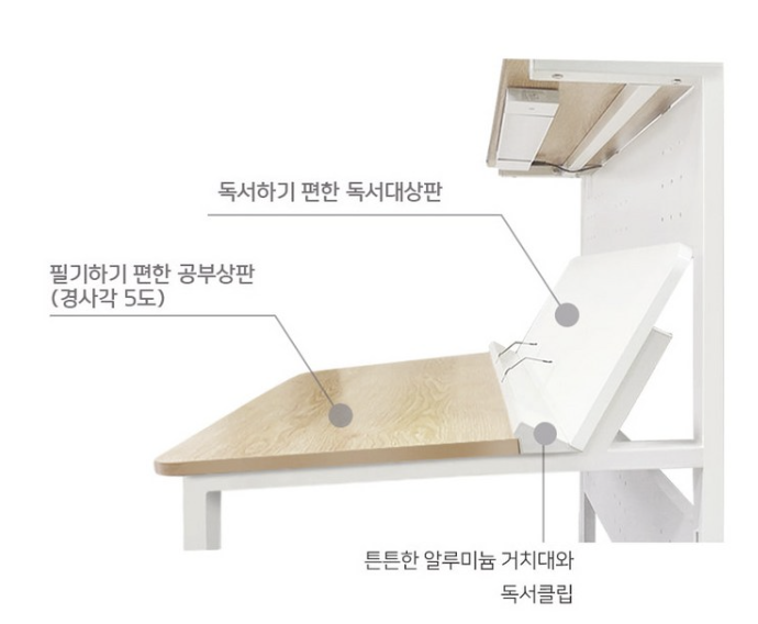 책상 상판이 두 가지 경사로 나뉘어 있어서, 책을 볼 때도 무리가 가지 않게끔 설계되어 있습니다. 아이가 책을 읽거나 숙제를 할 때, 책상과 적당한 각도가 맞춰지면 눈과 목에 부담이 덜 가고, 집중력이 높아집니다!
