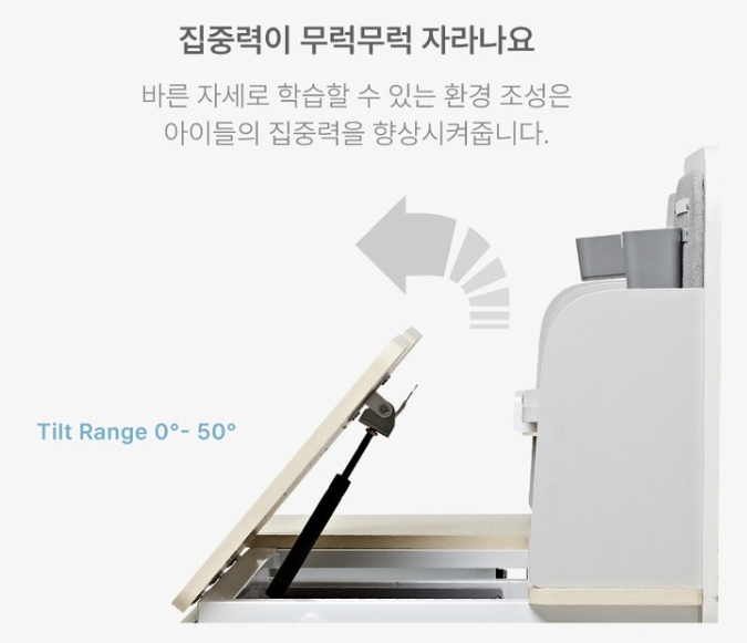각도조절이 가능해 책을 읽거나 필기를 할 때 자연스러운 자세로 공부할 수 있습니다. 아이가 자세가 흐트러지지 않도록 도와주는 기능이기 때문에, 장시간 공부를 하더라도 몸에 무리가 가지 않아요. "책상 각도가 조절돼서 아이가 앉아서 공부할 때 정말 편해요! 자세도 좋아졌어요!"라는 후기가 많습니다.