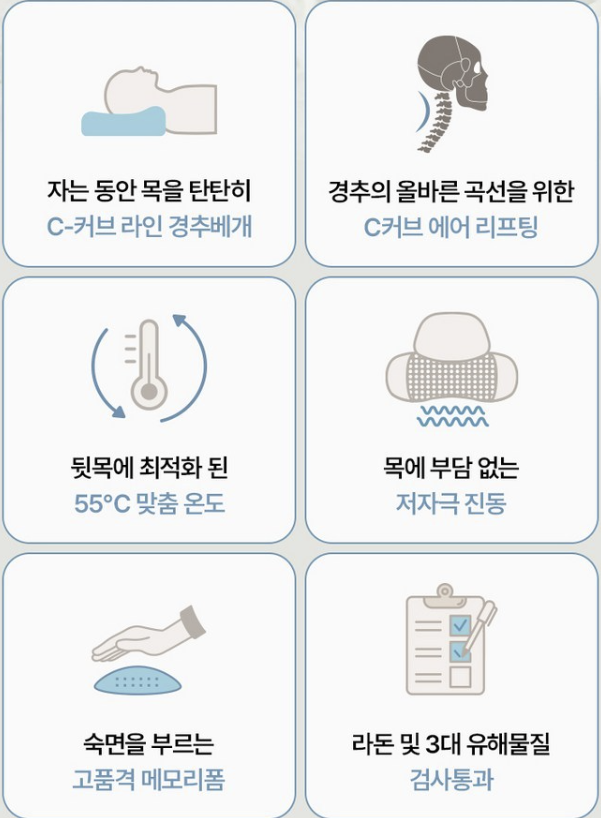 이 베개는 공기압 스트레칭, 온열찜질, 진동 마사지, 그리고 경추 C커브 디자인까지, 목과 어깨를 완벽하게 케어해주는 기능이 가득한 제품입니다.
