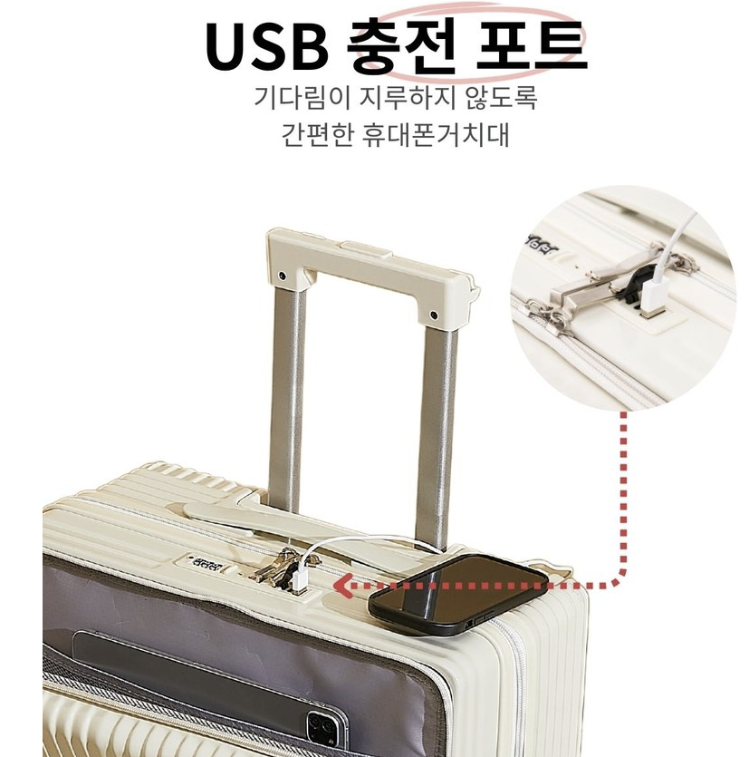 이 캐리어에는 USB 충전 포트가 내장되어 있어, 여행 중 언제든지 외부 배터리를 연결하여 스마트폰을 충전할 수 있습니다. 덕분에 긴 대기 시간에도 스마트폰 배터리가 부족할 걱정이 없답니다. 여행 중에도 스마트한 라이프를 유지할 수 있어요! 📱